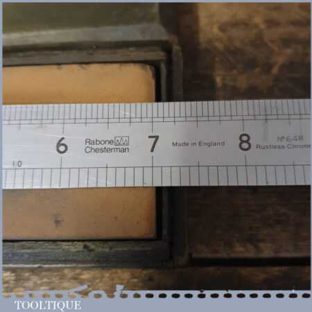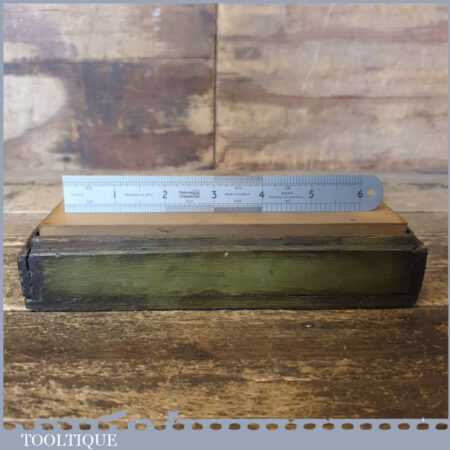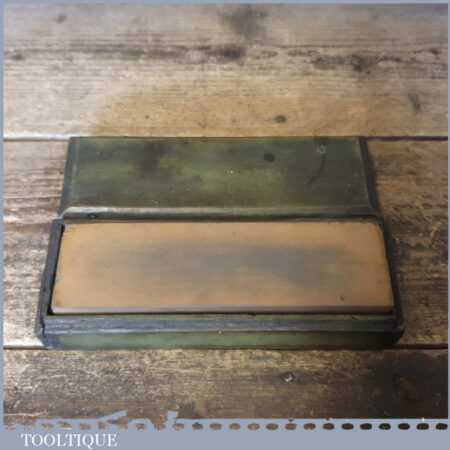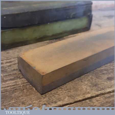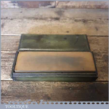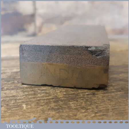 Vintage boxed 7”x 2” India combination oil stone with medium and course grit, in good used condition. Note: Top side lapped flat ready for use