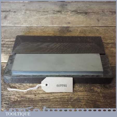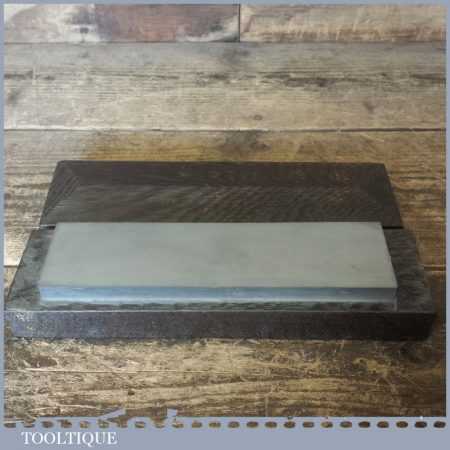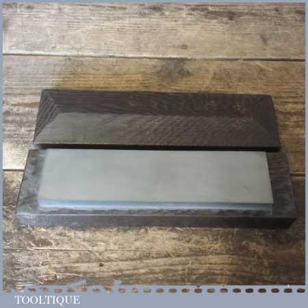 Vintage boxed 8” x 2″ medium grit Carborundum oil stone in a mahogany box and in good usable condition.