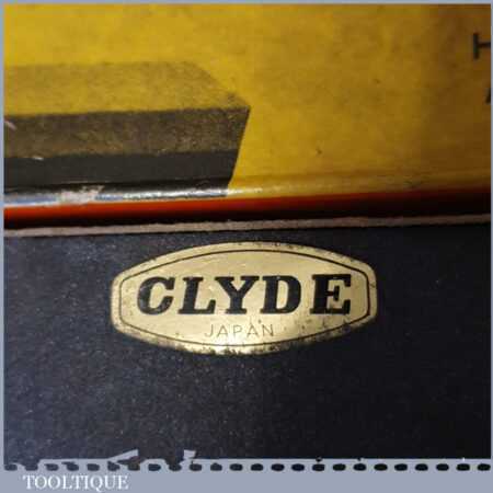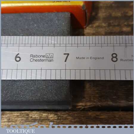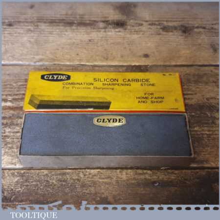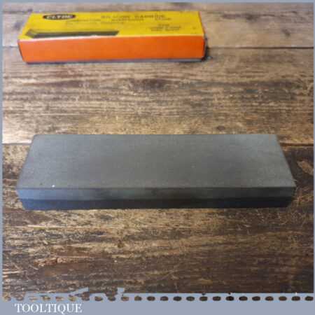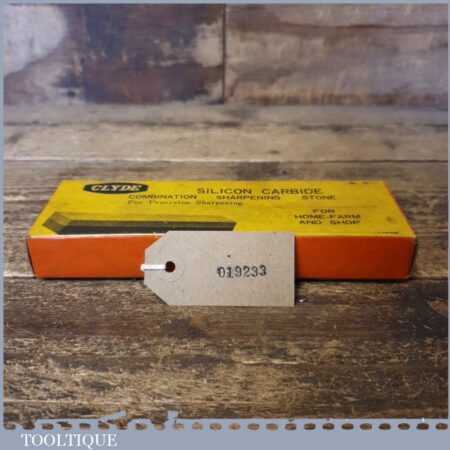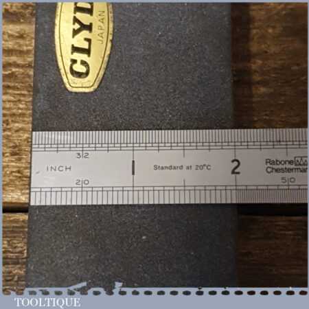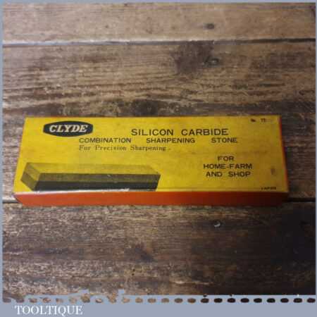 Vintage boxed Clyde, Japan 7”x 2” silicon carbide combination oil stone with medium and course grit, in good used condition. Note: lapped flat ready for use.