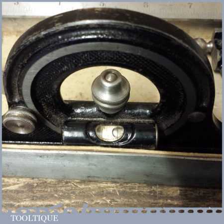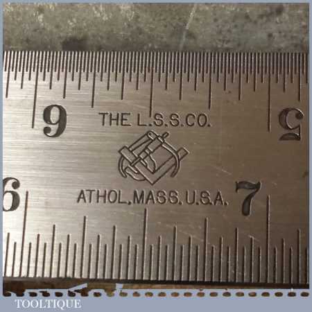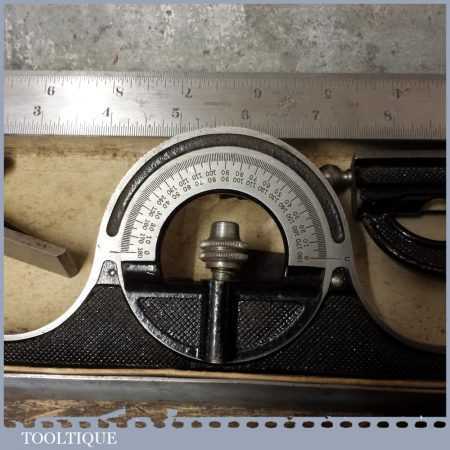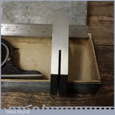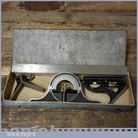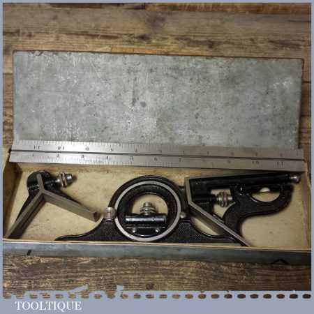 Crisp vintage boxed L.S.S. Co. USA cast steel combination square, protractor and centre finder complete and in excellent condition. This old tool has barely been used and the old steel box has done a great job of protecting it.