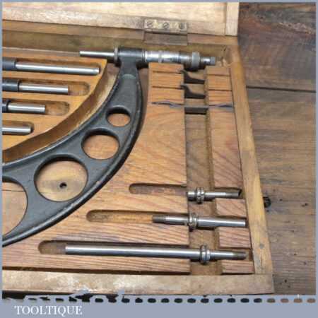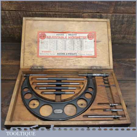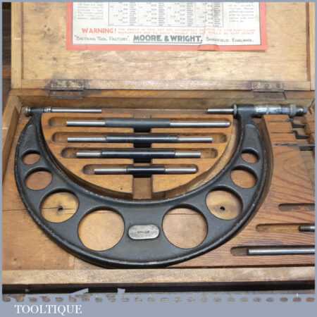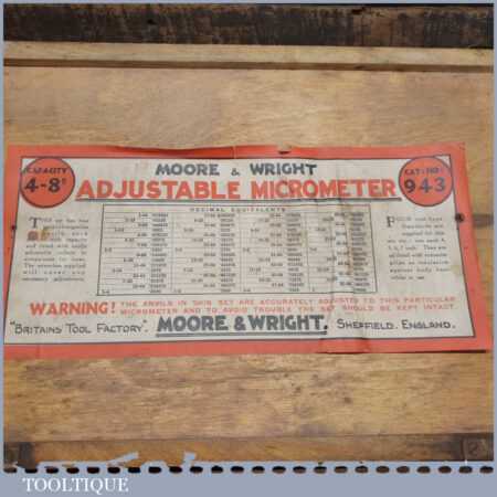 Vintage boxed Moore & Wright 4” – 8” imperial micrometer in good used condition.