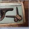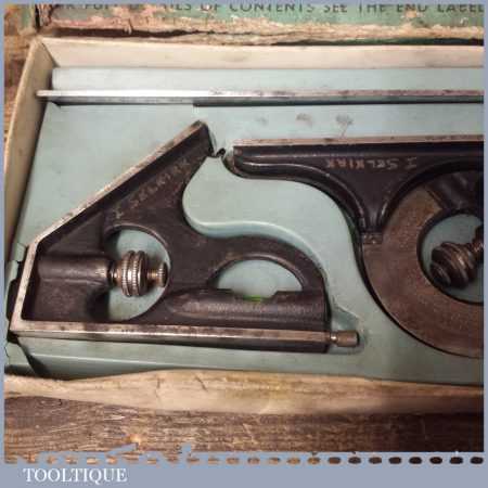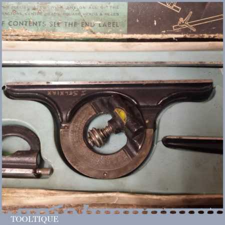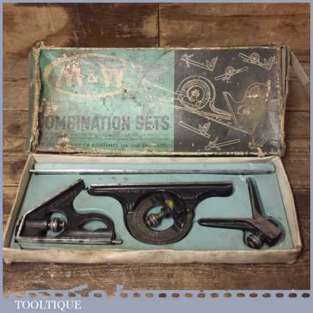 Vintage boxed Moore & Wright cast steel combination square, protractor and centre finder complete and in good used condition.