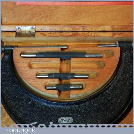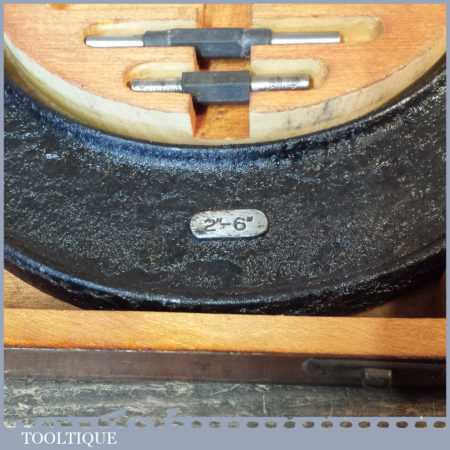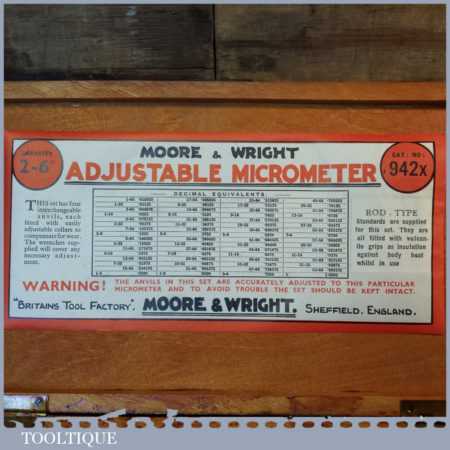 Vintage boxed No: 942 Moore & Wright 2”- 6” micrometer in good used condition. Note: incomplete.