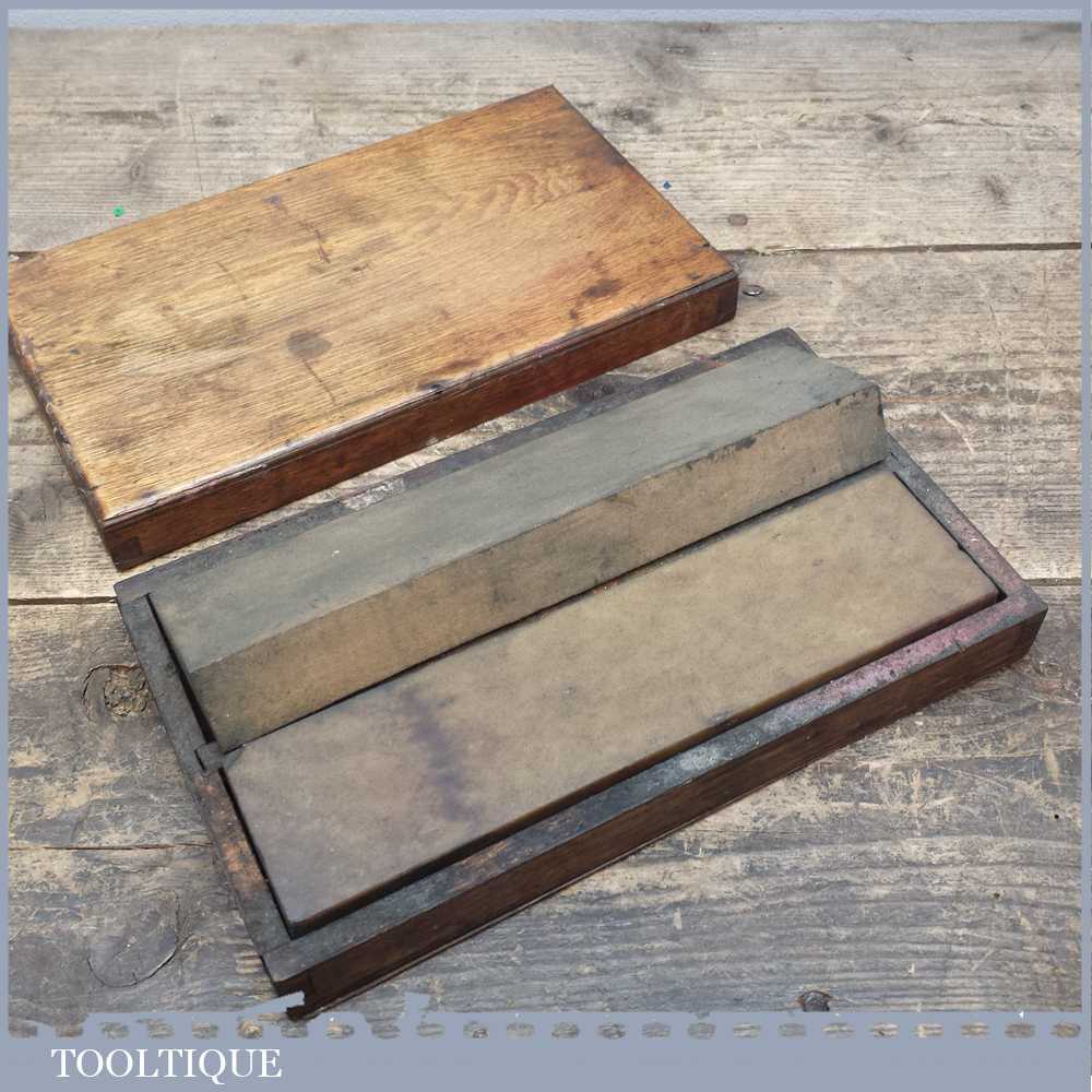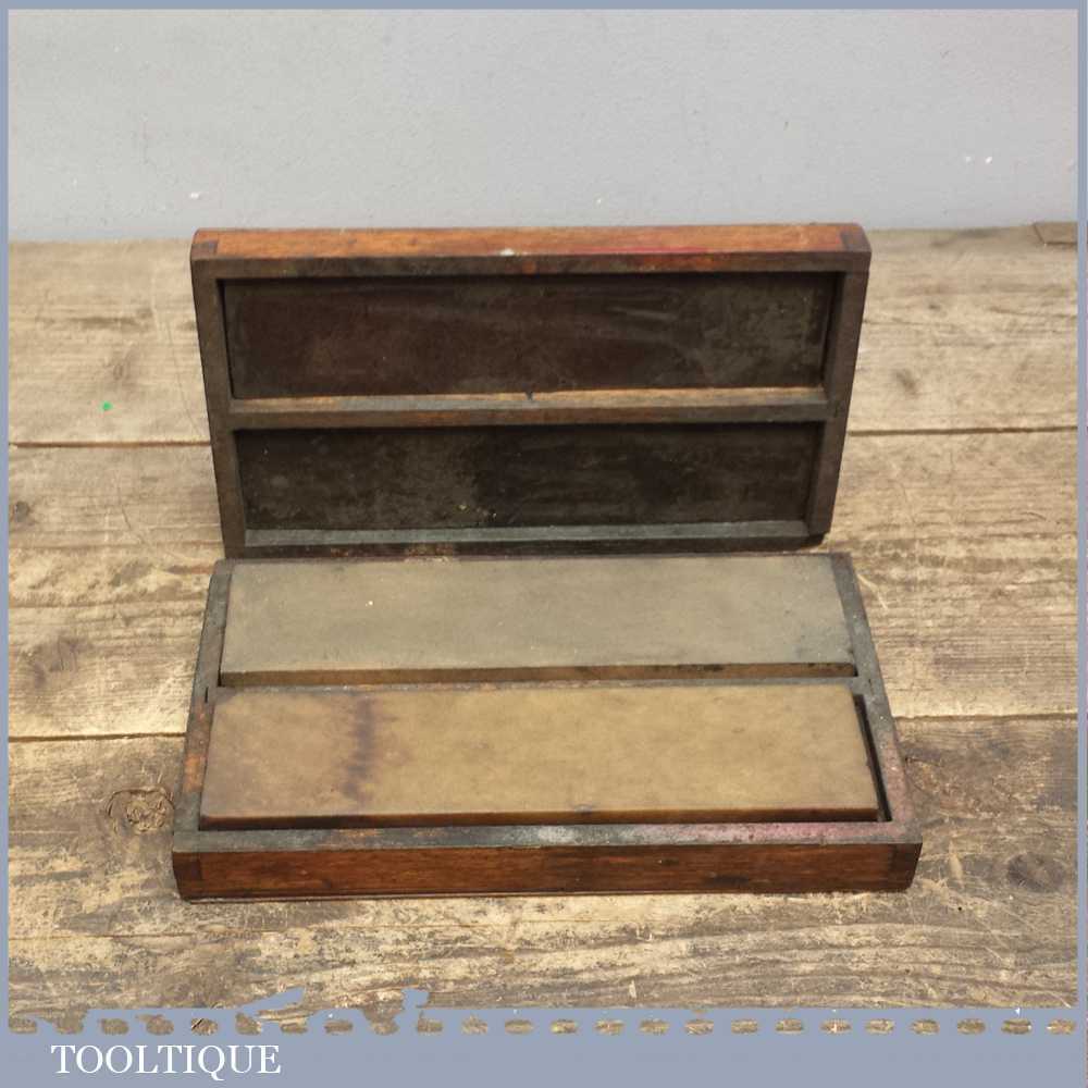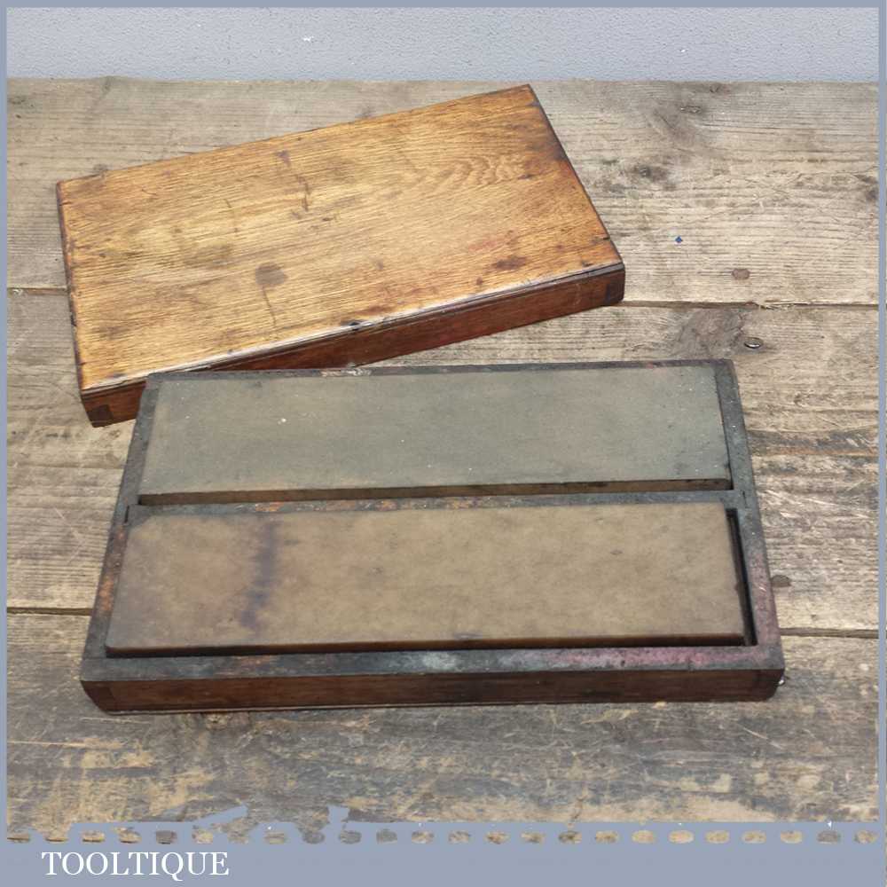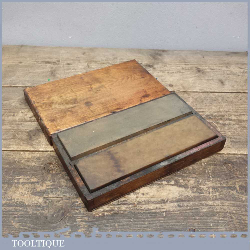 Vintage boxed pair of 8” oil stones, 1 medium grit India oilstone and a natural Washita stone in good used condition.