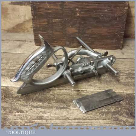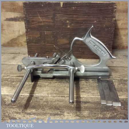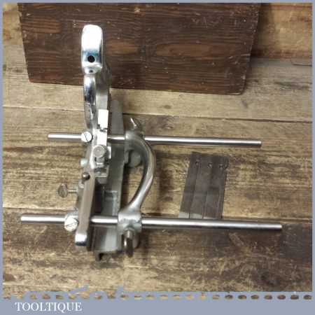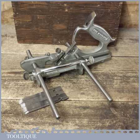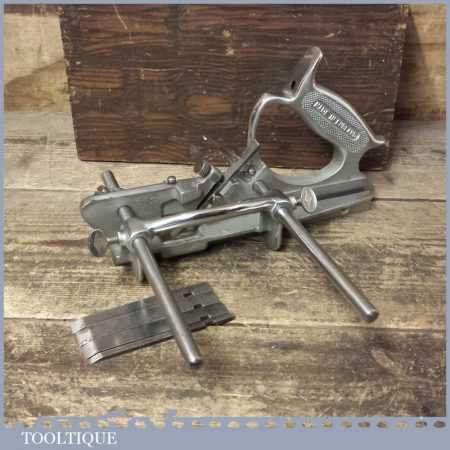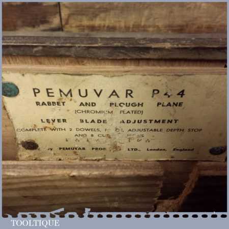 Vintage boxed Pemuvar No: P44 plough plane complete with 5 cutters, fully refurbished and ready for use. The plane is in good condition and all components move smoothly. Note: We do not sharpen the irons.