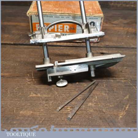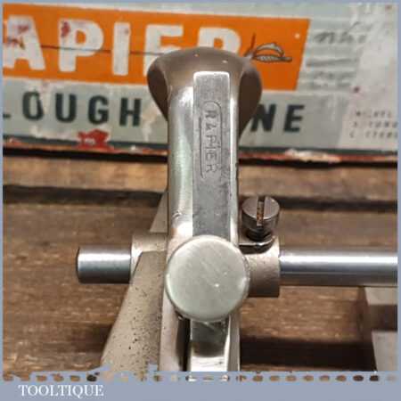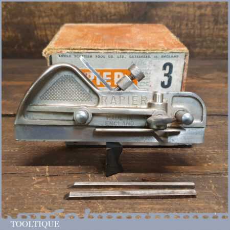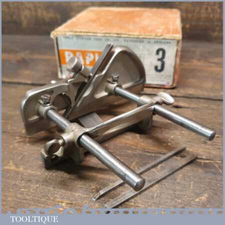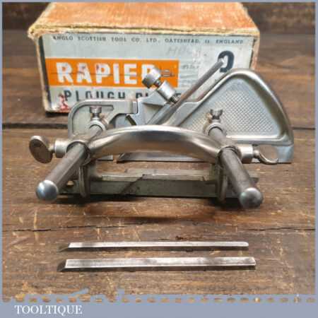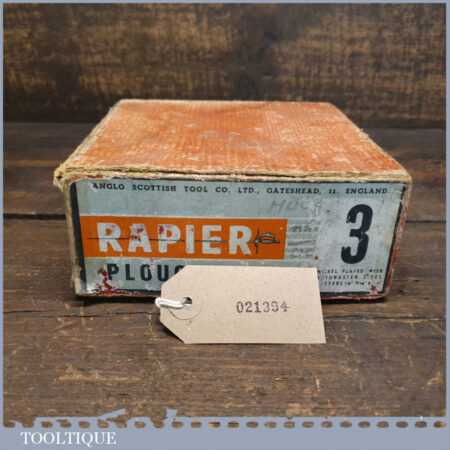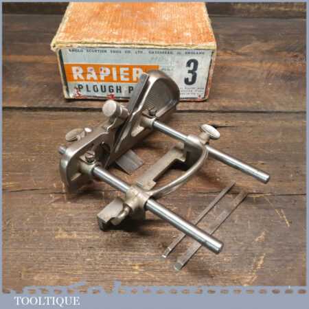 Vintage boxed Rapier No: 3 plough plane (Record equip No: 043) complete with 3 cutters, fully refurbished and ready for use. The plane is in good condition and all components move smoothly. Note: We do not sharpen the irons.