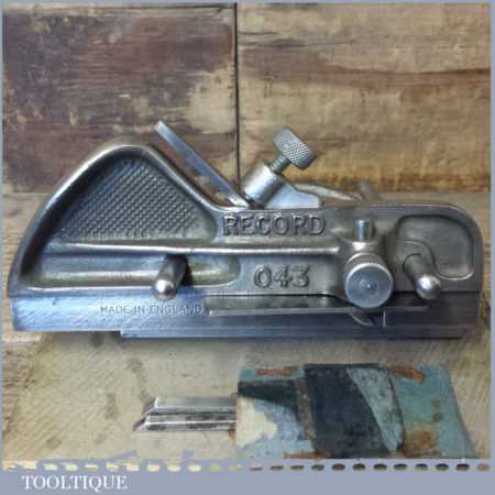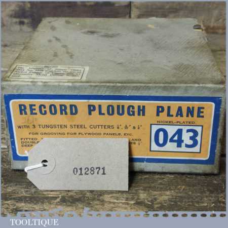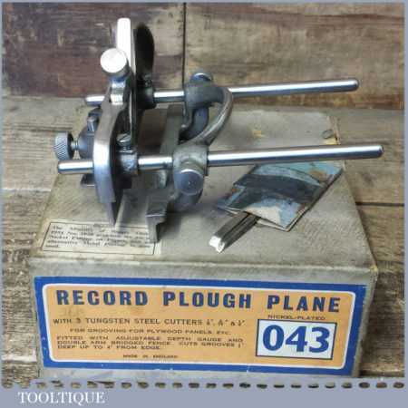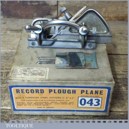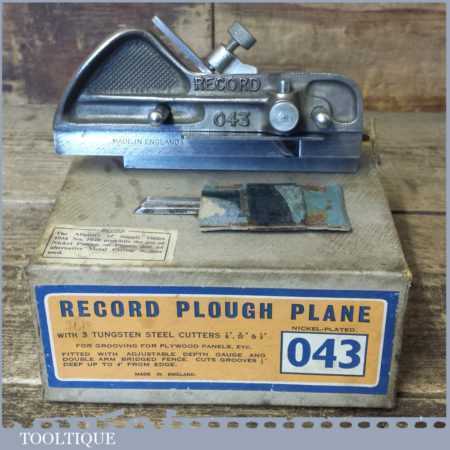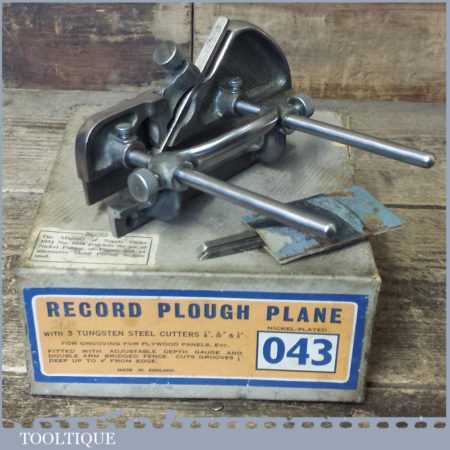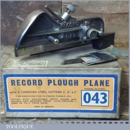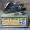 Vintage boxed Record No: 043 plough plane complete with 3 cutters, fully refurbished and ready for use. The plane is in good condition and all components move smoothly. Note: We do not sharpen the irons.