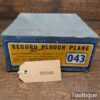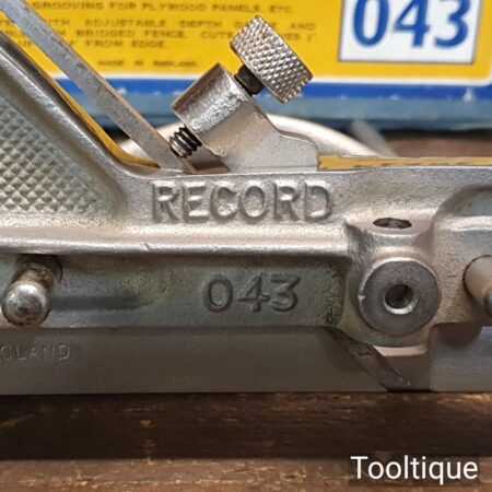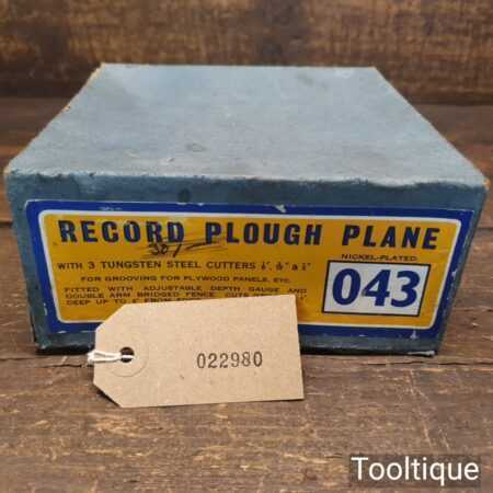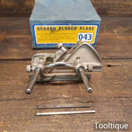 Vintage boxed Record No: 043 plough plane complete with 3 cutters, fully refurbished and ready for use. The plane is in good condition and all components move smoothly. Note: We do not sharpen the irons.