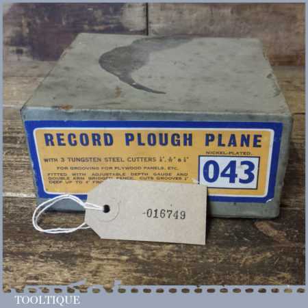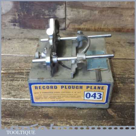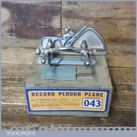 Vintage boxed Record No: 043 plough plane complete with 3 cutters, fully refurbished and ready for use. The plane is in little used condition and all components move smoothly. Note: We do not sharpen the irons.