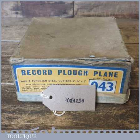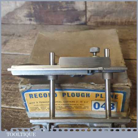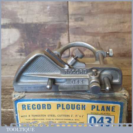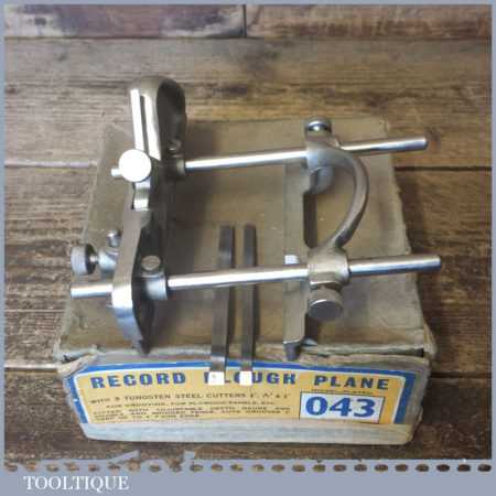 Vintage boxed Record No: 043 plough plane complete with 3 cutters, fully refurbished and ready for use. The plane is in good condition and all components move smoothly. Note: We do not sharpen the irons.