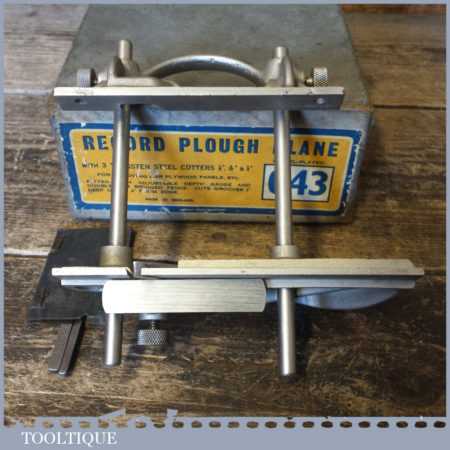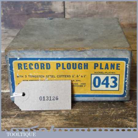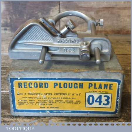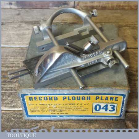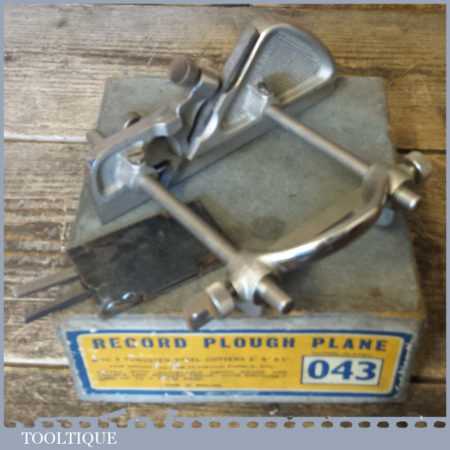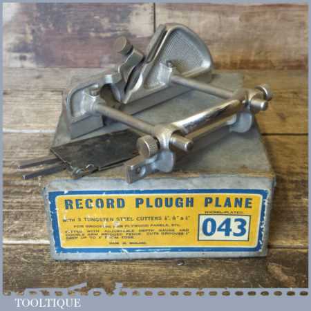 Vintage boxed Record No: 043 plough plane complete with 3 cutters, fully refurbished and ready for use. The plane is in good condition and all components move smoothly. Note: We do not sharpen the irons.