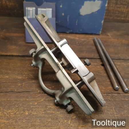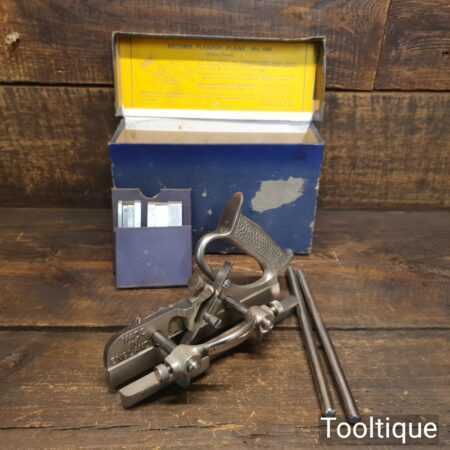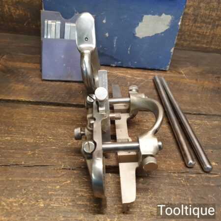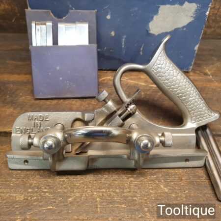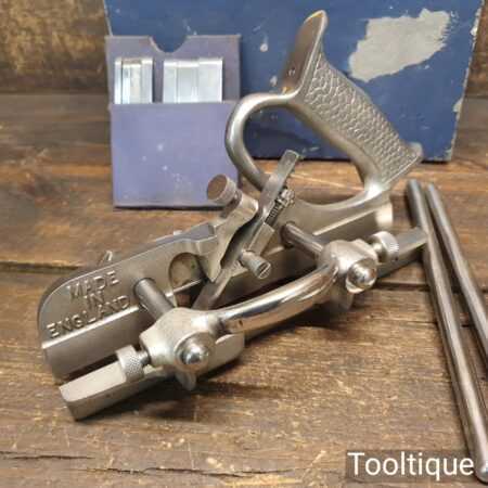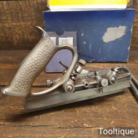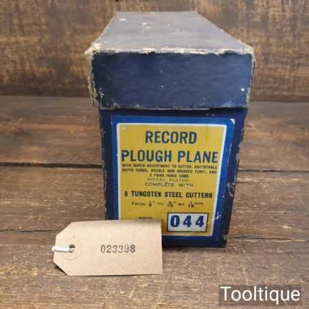 Vintage boxed Record No: 044 plough plane complete with 8 cutters, fully refurbished and ready for use. The plane is in good condition and all components move smoothly. Note: We do not sharpen the irons