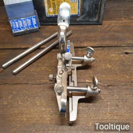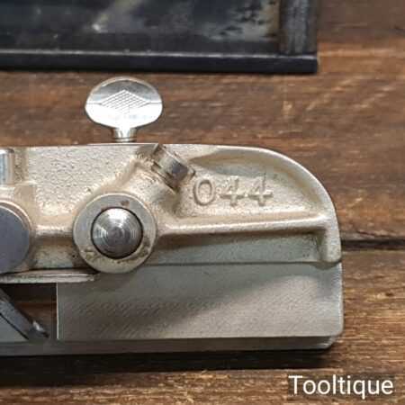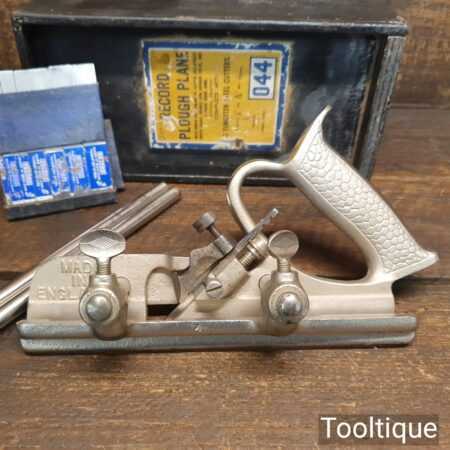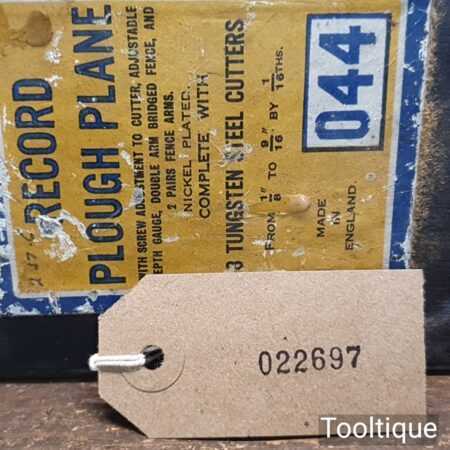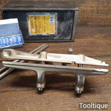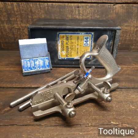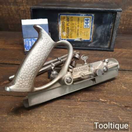 Vintage boxed Record No: 044 plough plane complete with 8 cutters, fully refurbished and ready for use. The plane is in good condition and all components move smoothly. Note: We do not sharpen the irons.