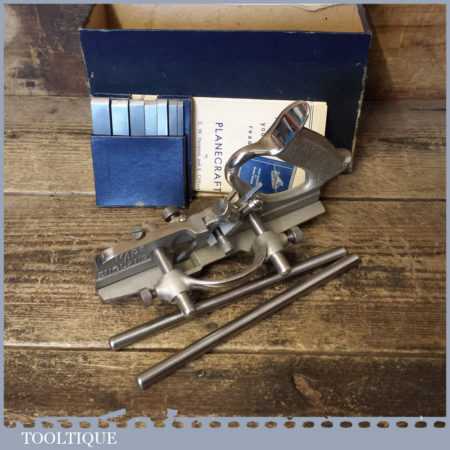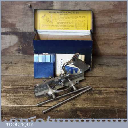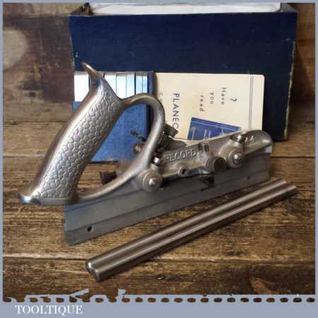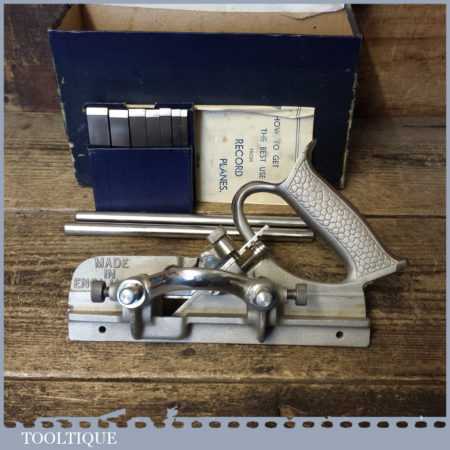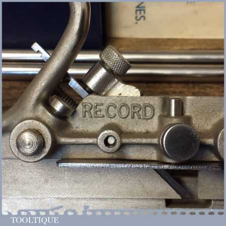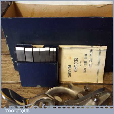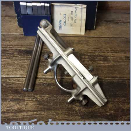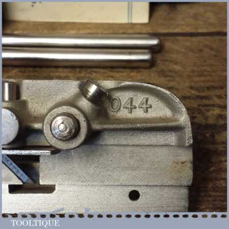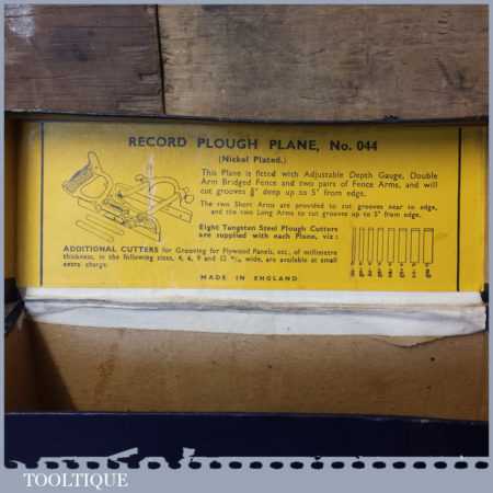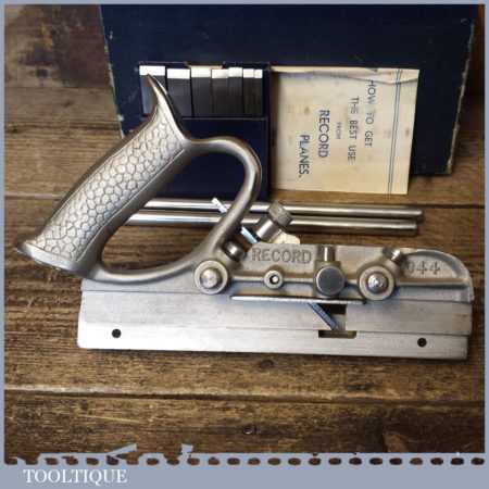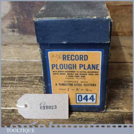 Vintage boxed Record No: 044 plough plane complete with 8 cutters, fully refurbished and ready for use. The plane is in good condition and all components move smoothly. Note: We do not sharpen the irons.