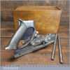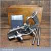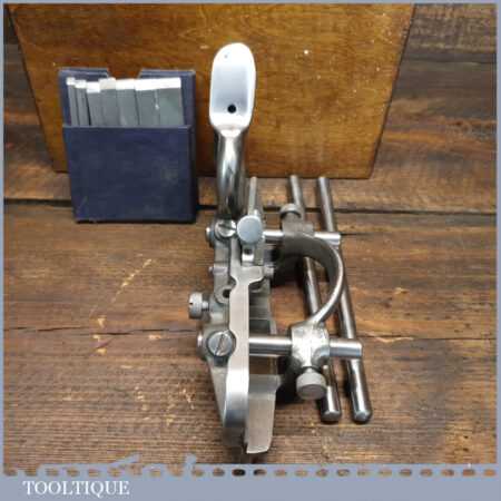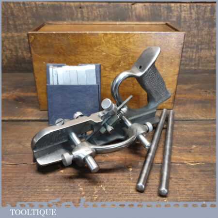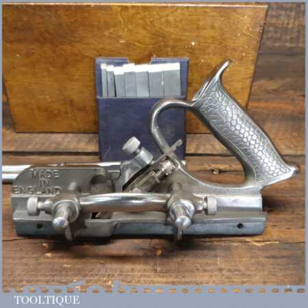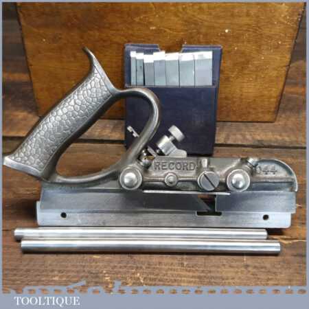 Vintage boxed Record No: 044 plough plane complete with 8 cutters, fully refurbished and ready for use. The plane is in good condition and all components move smoothly. Note: We do not sharpen the irons.