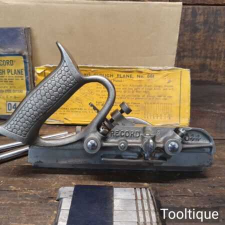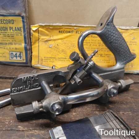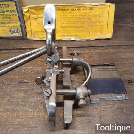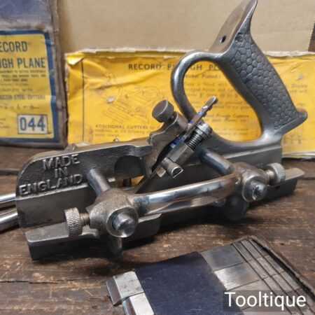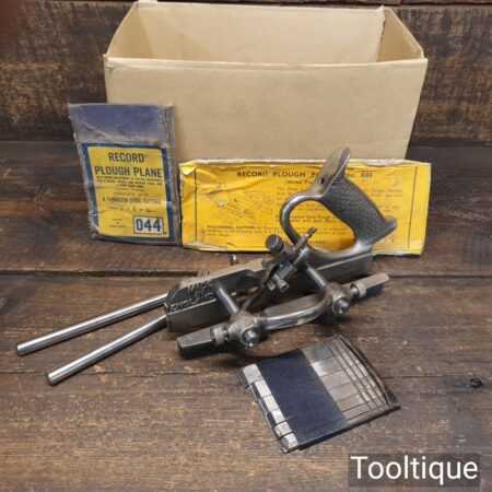 Vintage boxed Record No: 044 plough plane complete with 8 cutters, fully refurbished and ready for use. The plane is in good condition and all components move smoothly. Note: We do not sharpen the irons.
