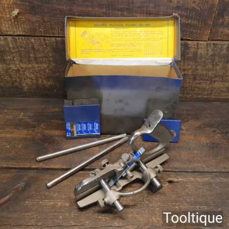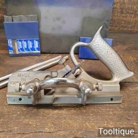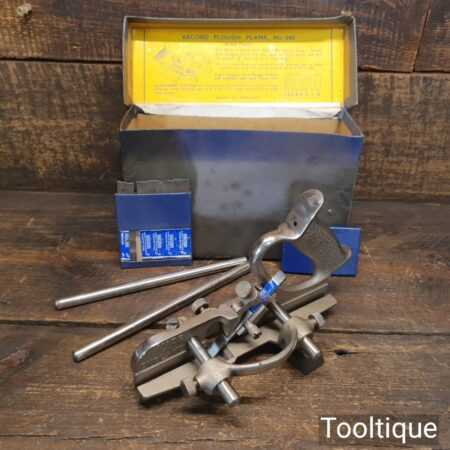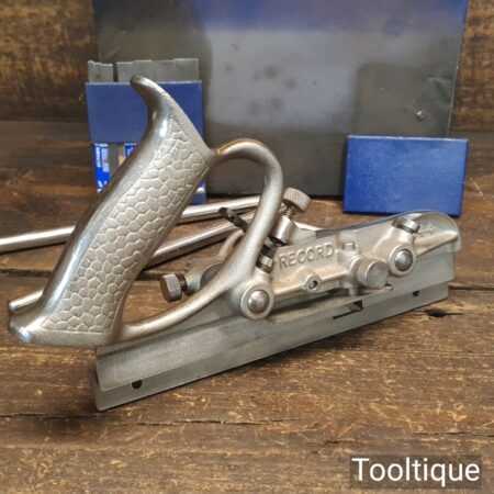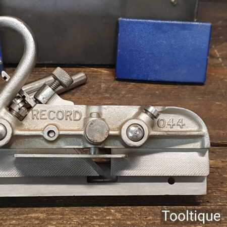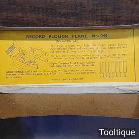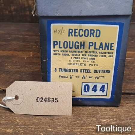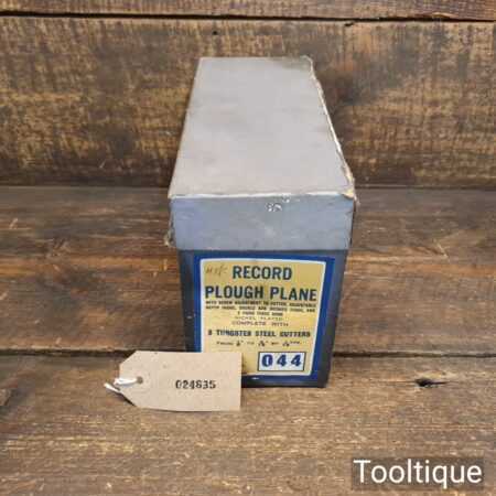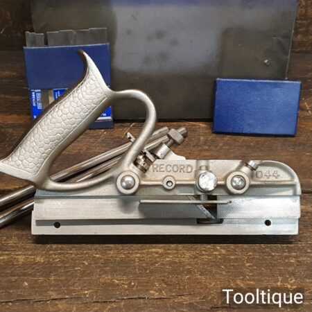 Vintage boxed Record No: 044 plough plane complete with 8 cutters fully refurbished and ready for use. The plane is in good condition and all components move smoothly. Note: We do not sharpen the irons.