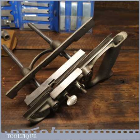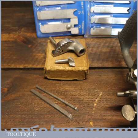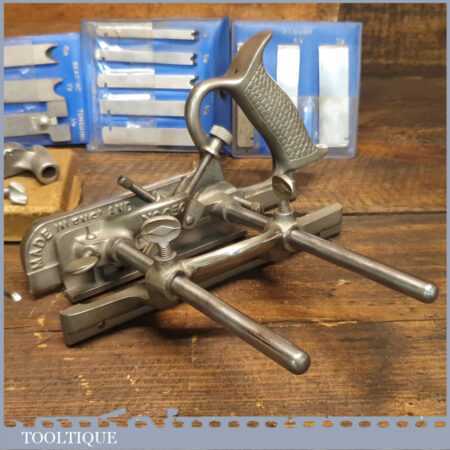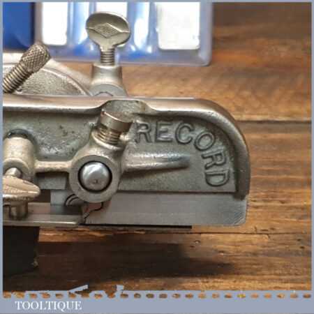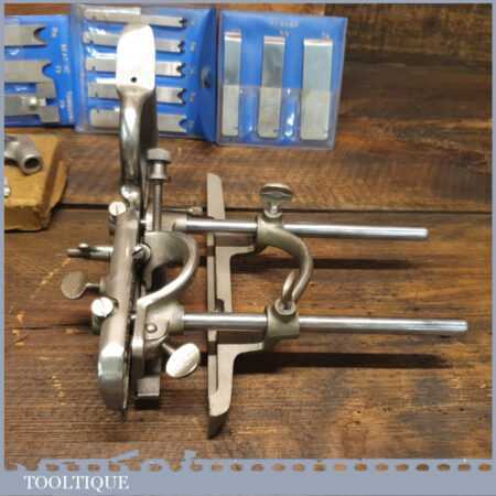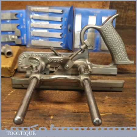 Vintage boxed Record No: 050 combination plough plane complete with 17 cutters, fully refurbished and ready for use. The plane is in good condition and all components move smoothly. Note: We do not sharpen the irons.