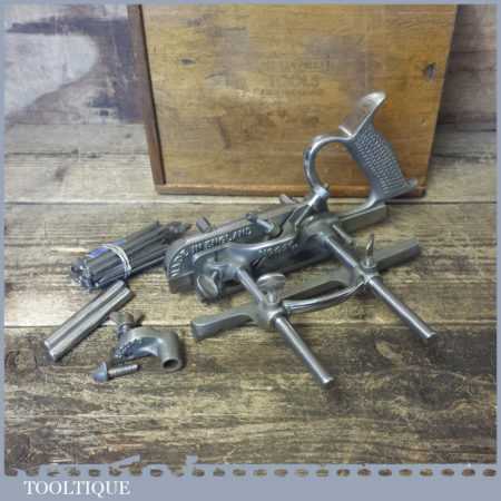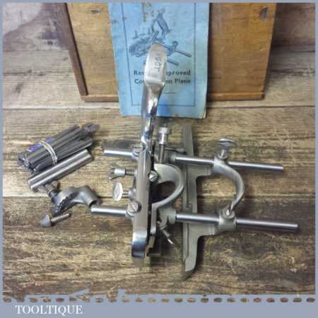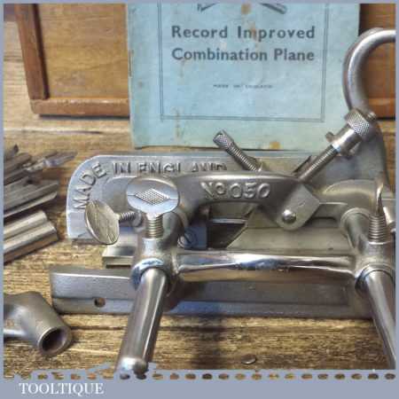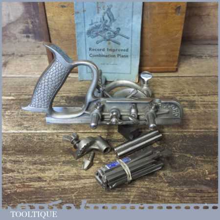 Vintage boxed Record No: 050 combination plough plane complete with cutters, fully refurbished and ready for use. The plane is in good condition and all components move smoothly. The one advantage these planes have over the Stanley No: 50 is that used irons are more readily available due to the fact the 405/45 used the same style cutters. Note: We do not sharpen the irons.