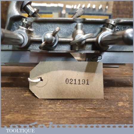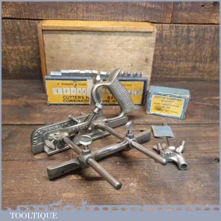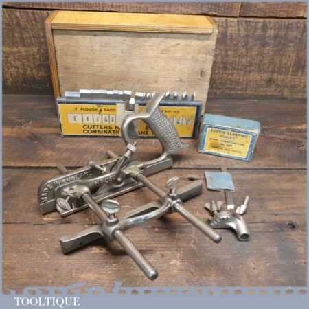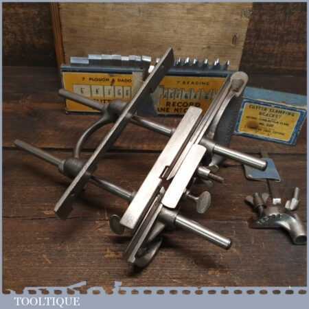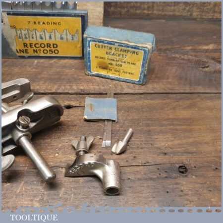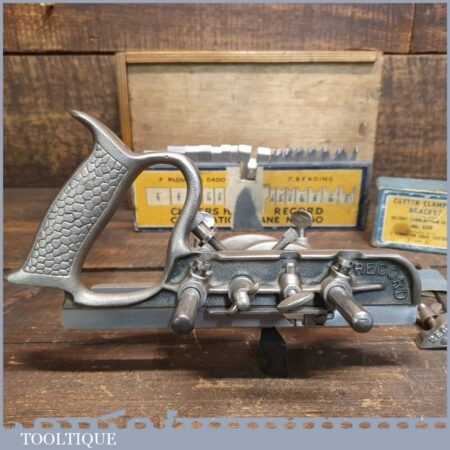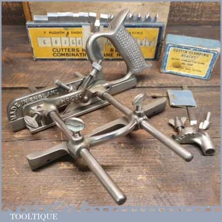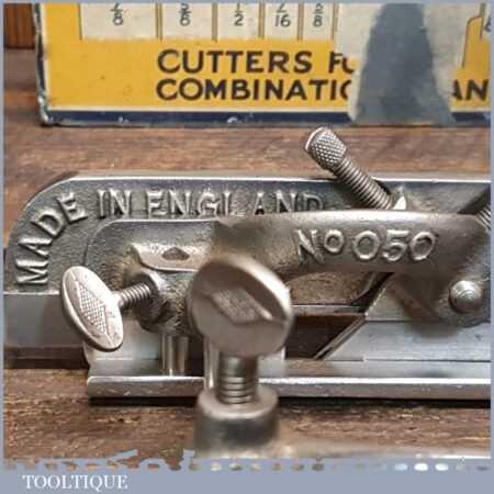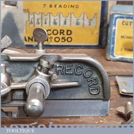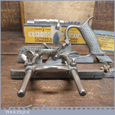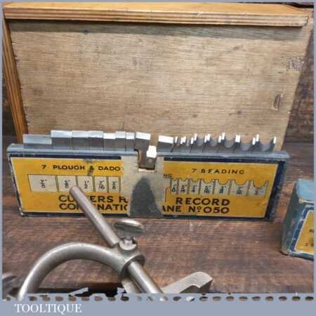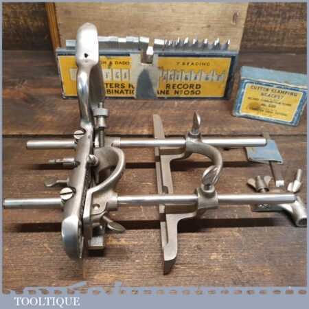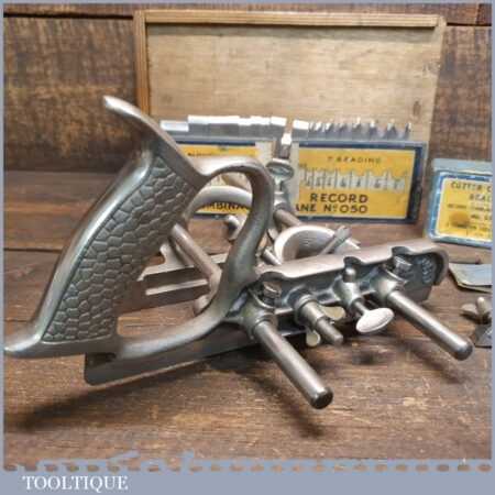 Vintage Boxed Record No: 050 combination plough plane complete with 18 cutters, fully refurbished and ready for use. The plane is in good condition and all components move smoothly. Note: We do not sharpen the irons.
