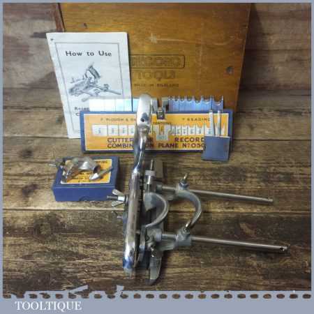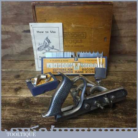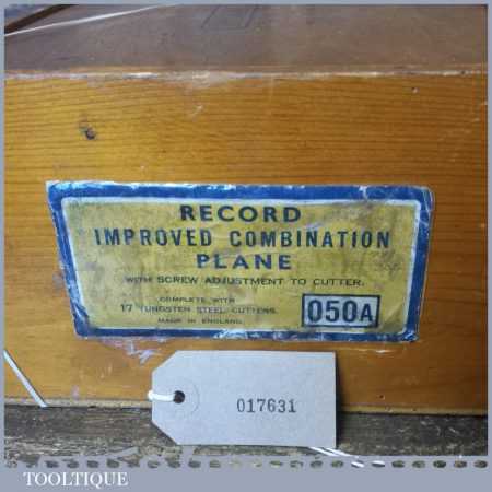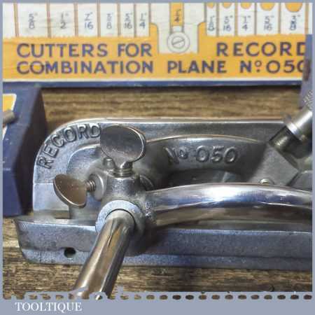Vintage boxed Record No: 050A combination plough plane complete with 17 cutters, fully refurbished and ready for use. The plane is in good condition and all components move smoothly. Note: We do not sharpen the irons