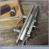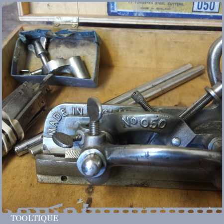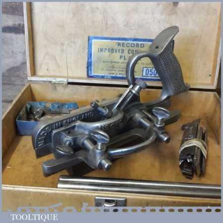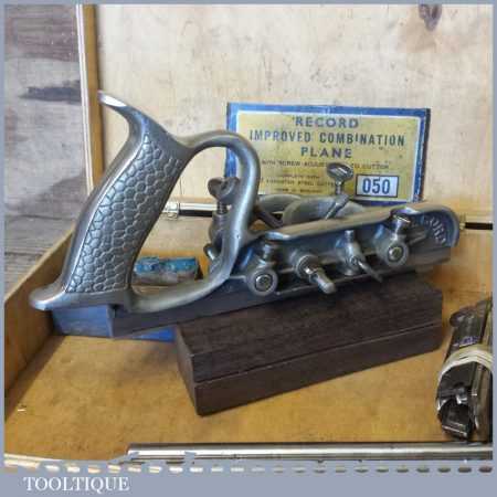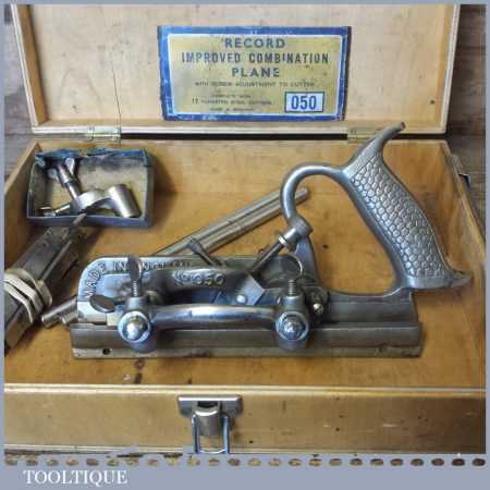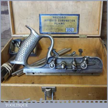 Vintage boxed Record No: 050A combination plough plane complete with 18 cutters, fully refurbished and ready for use. The plane is in good condition and all components move smoothly. Note: We do not sharpen the irons.