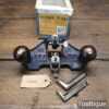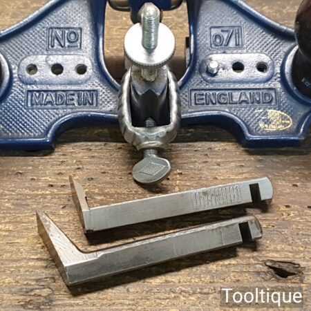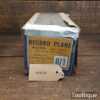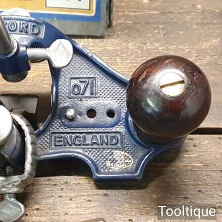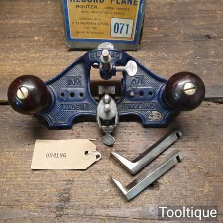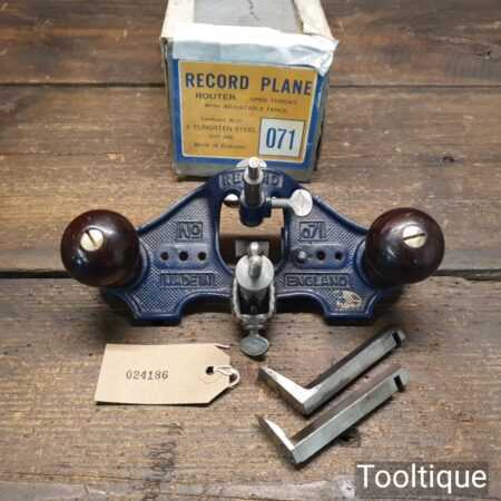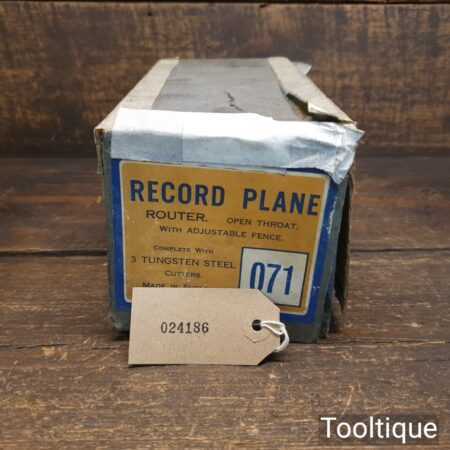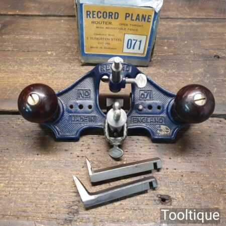 Vintage boxed Record No: 071 hand router plane complete with fence, depth stop and 3 irons and in good used condition. Note: the box is tatty but has kept the plane in good condition.