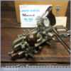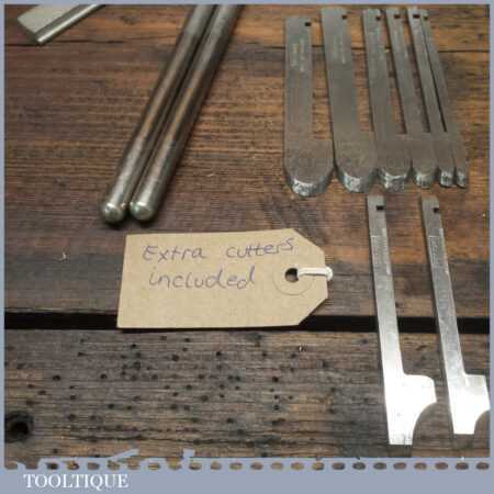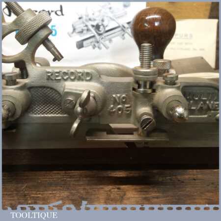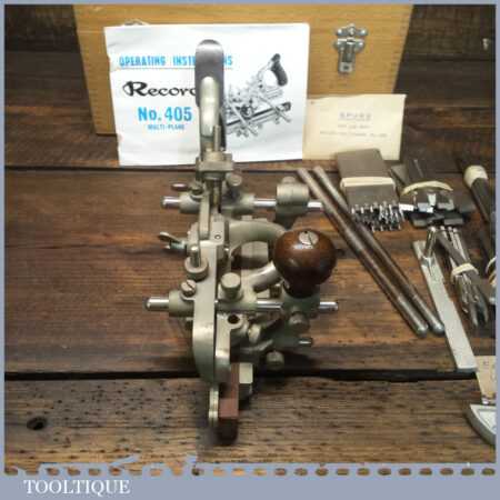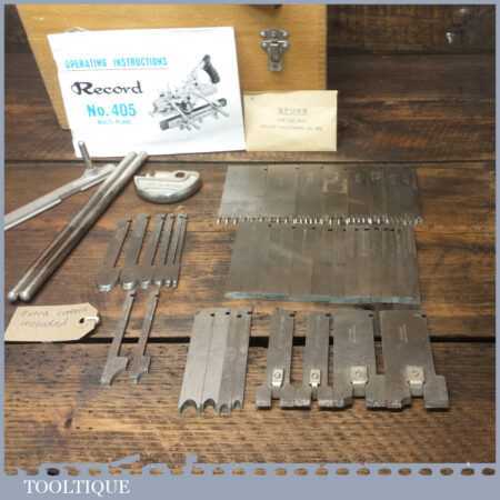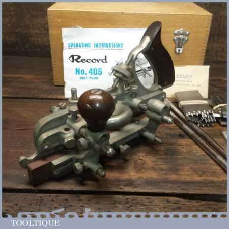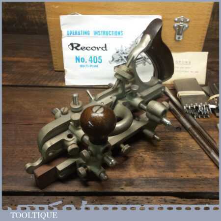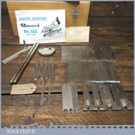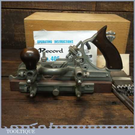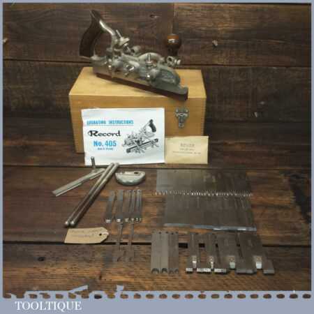 Vintage boxed Record No: 405 combination plough plane plus additional extra cutters. The full set cutters are as shown in the manual and this is complete, plus it has the extra cutters shown which were an additional option for this plane. There are a set of hollowing, reeding cutters and the additional pair of sash cutters. The plane is in good condition and all components move smoothly.