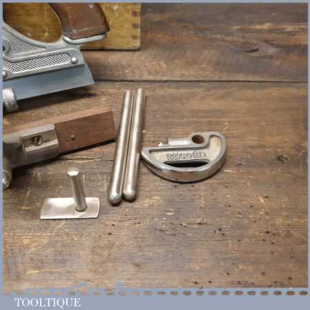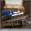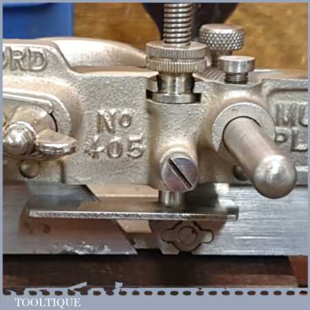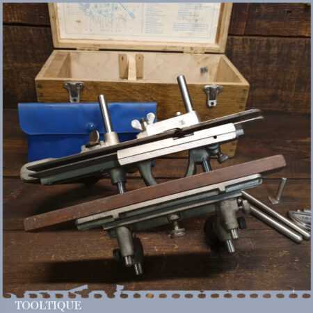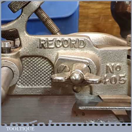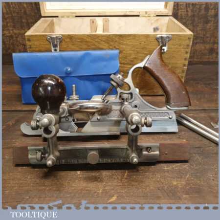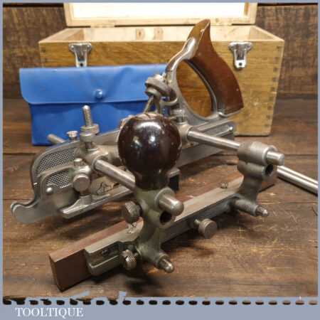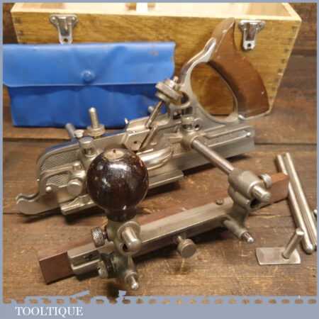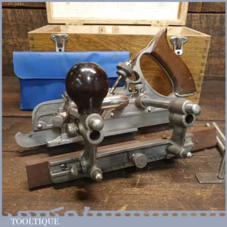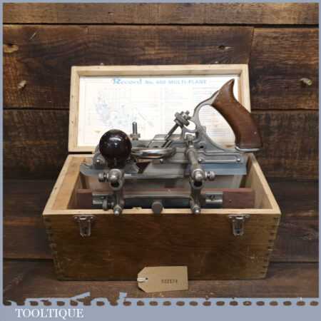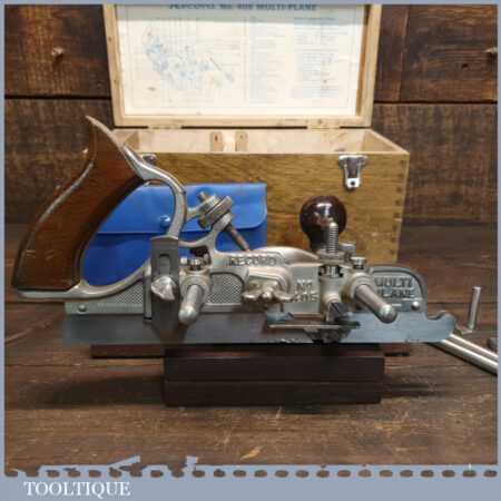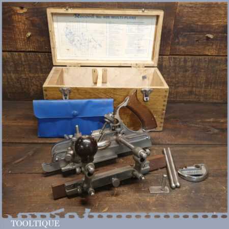 Vintage boxed Record No: 405 combination plough plane complete with 22 cutters, fully refurbished and ready for use. The plane is in good condition and all components move smoothly. Note: We do not sharpen the irons, and screwdriver missing and slight crack in the wood section of the handle, this has been treated and is solid