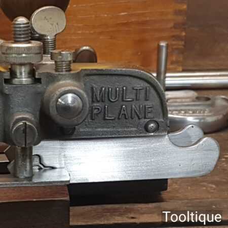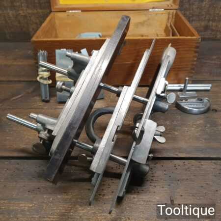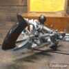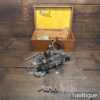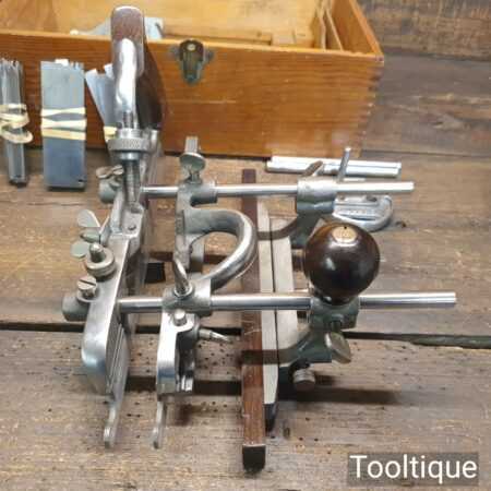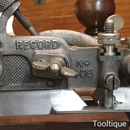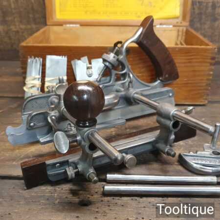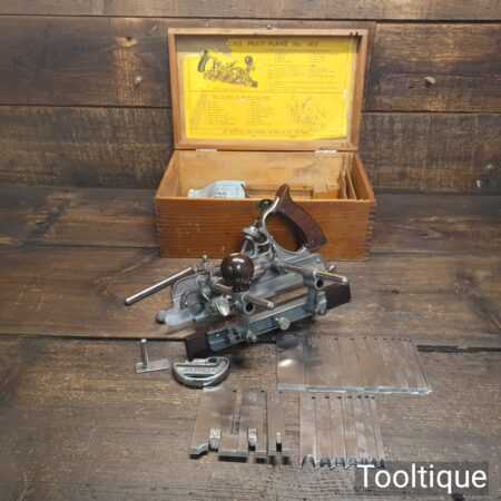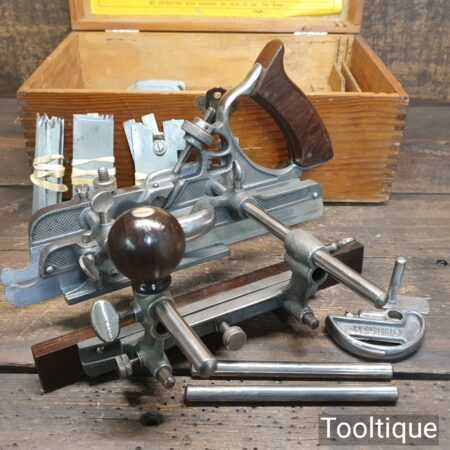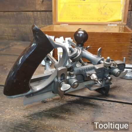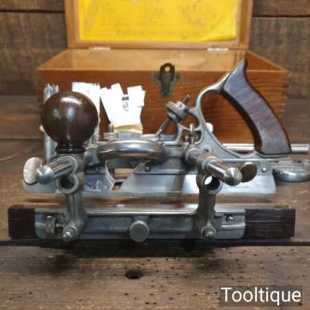 Vintage boxed Record No: 405 combination plough plane complete with 22 cutters, fully refurbished and ready for use. The plane is in good condition and all components move smoothly. Note: We do not sharpen the irons.