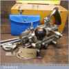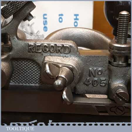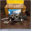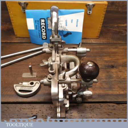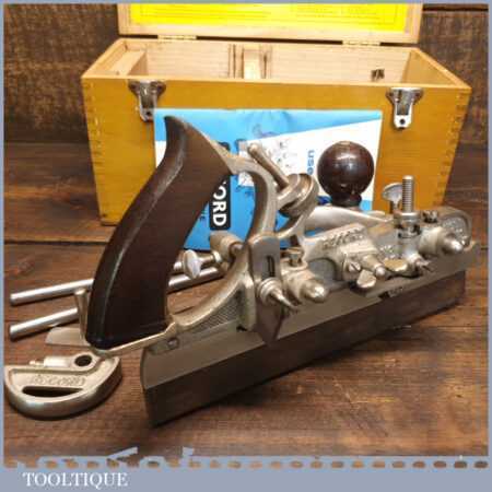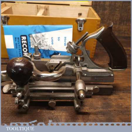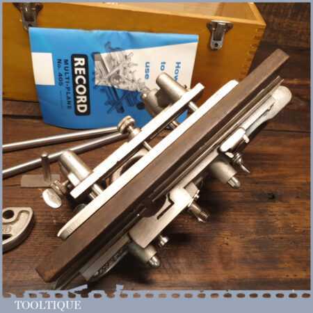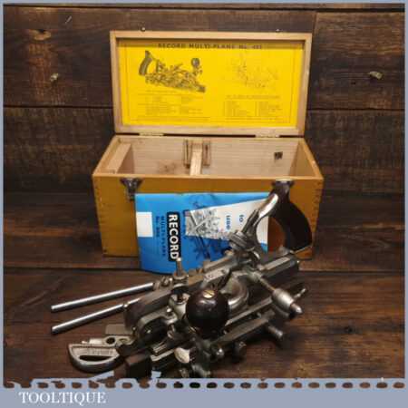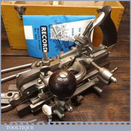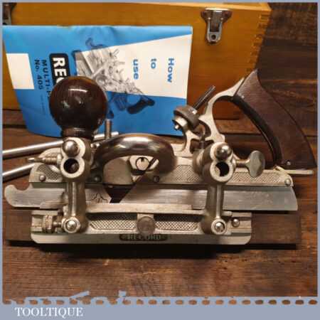 Vintage boxed Record No: 405 combination plough plane complete with 22 cutters, fully refurbished and ready for use. The plane is in little used condition and all components move smoothly. Note: We do not sharpen the irons.