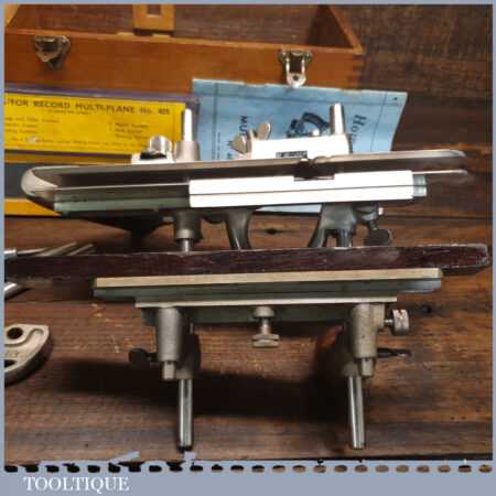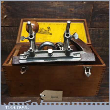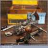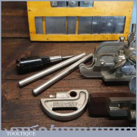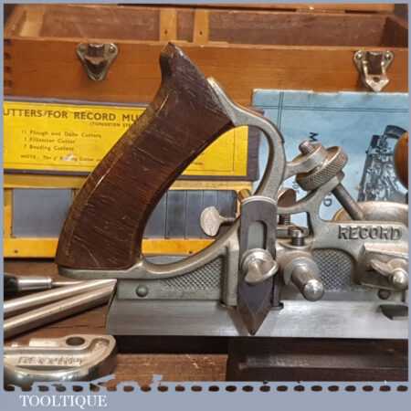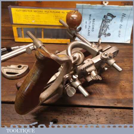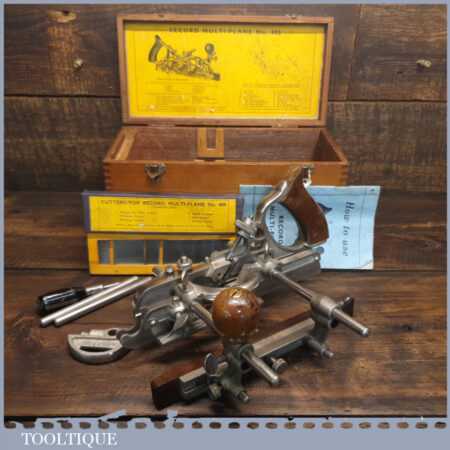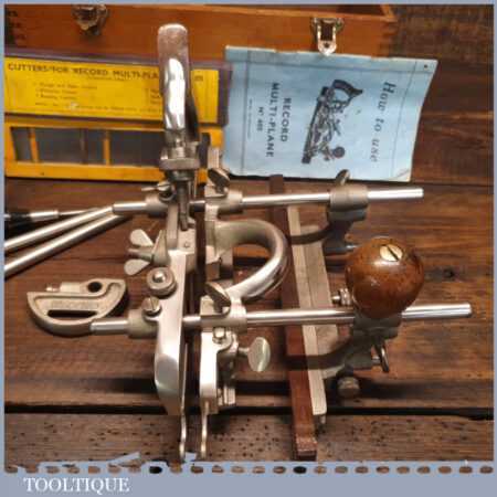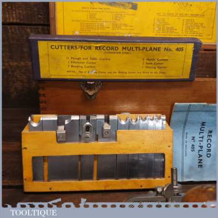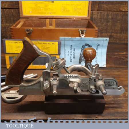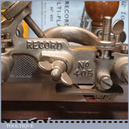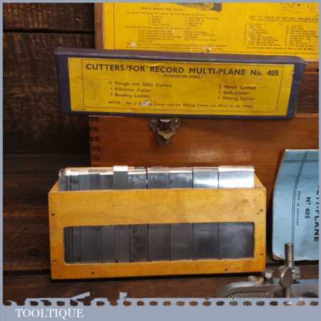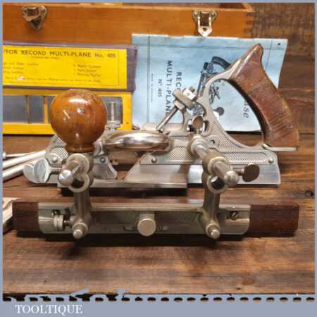 Vintage boxed Record No: 405 combination plough plane complete with 22 cutters, fully refurbished and ready for use. The plane is in good condition and all components move smoothly. Note: We do not sharpen the irons.