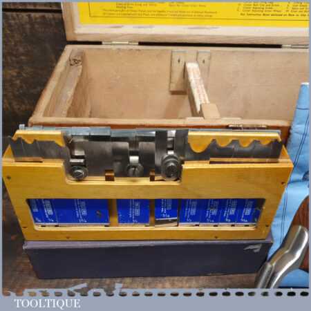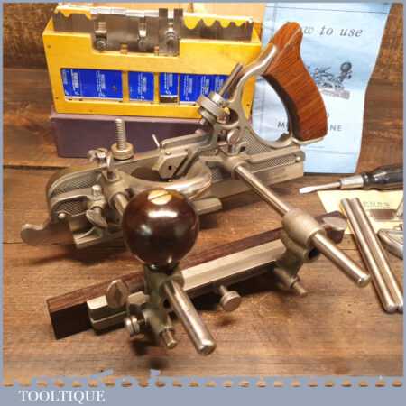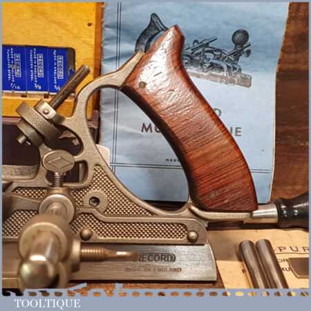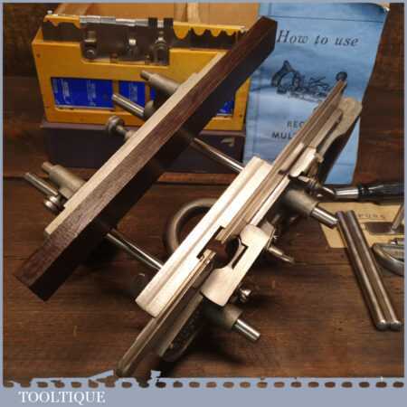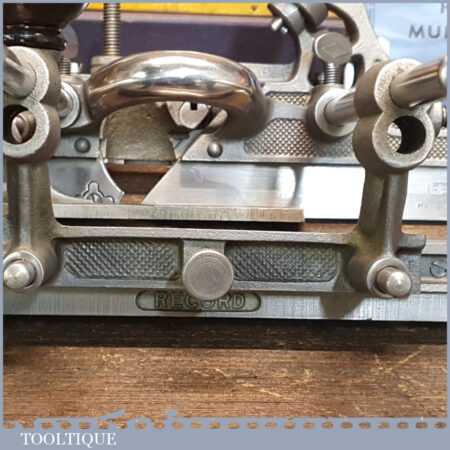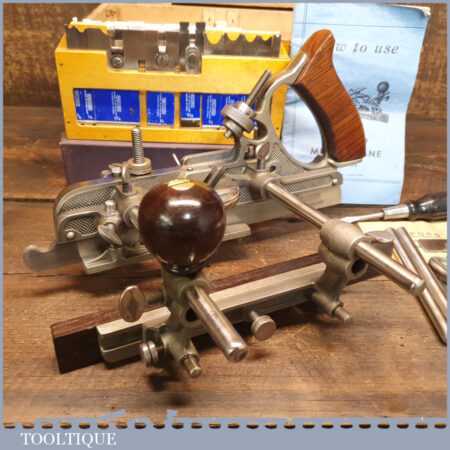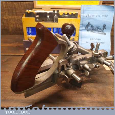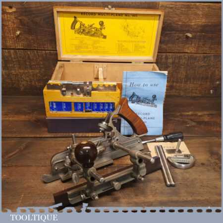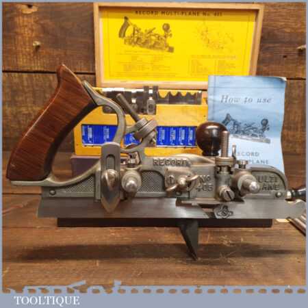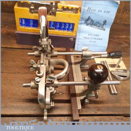Vintage boxed Record No: 405 combination plough plane complete with 22 cutters, fully refurbished and ready for use. The plane is in good condition and all components move smoothly. Note: We do not sharpen the irons.