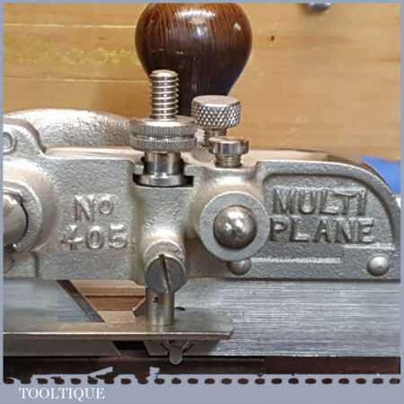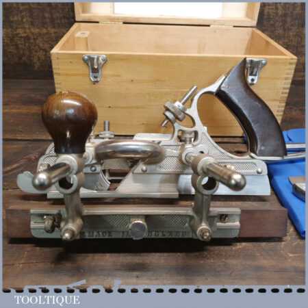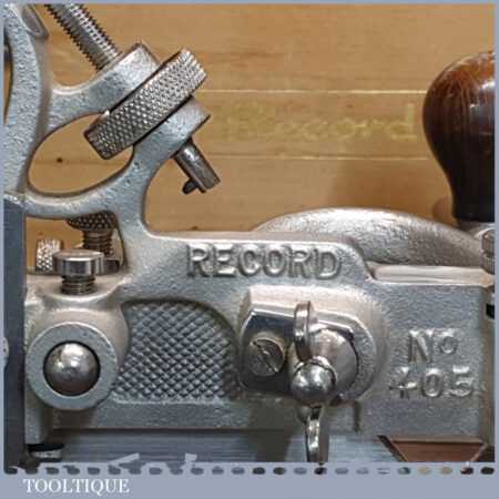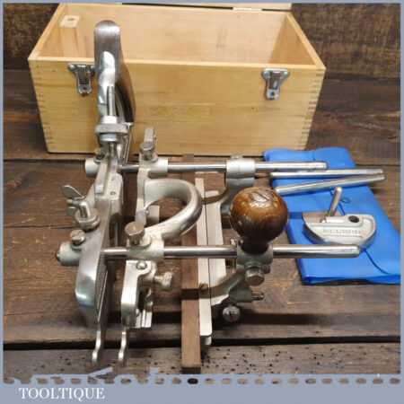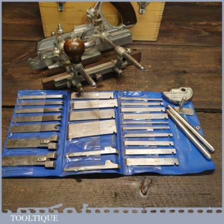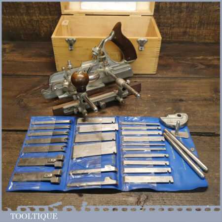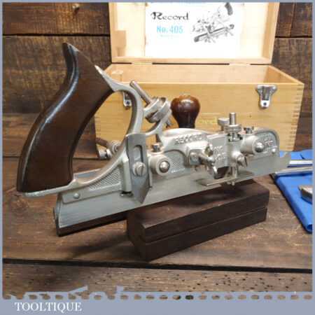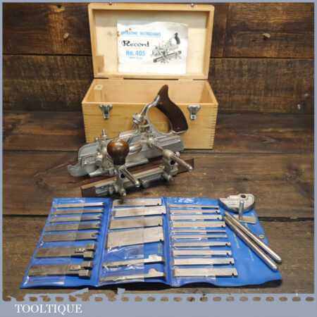 Vintage boxed Record No: 405 combination plough plane complete with 23 cutters, fully refurbished and ready for use. The plane is in good condition and all components move smoothly. Note: We do not sharpen the irons.