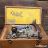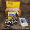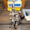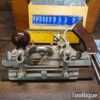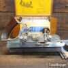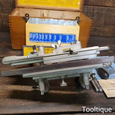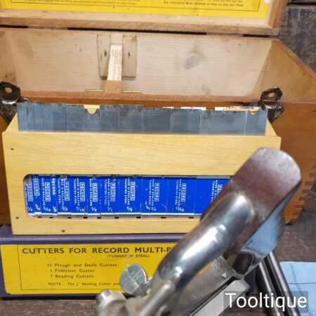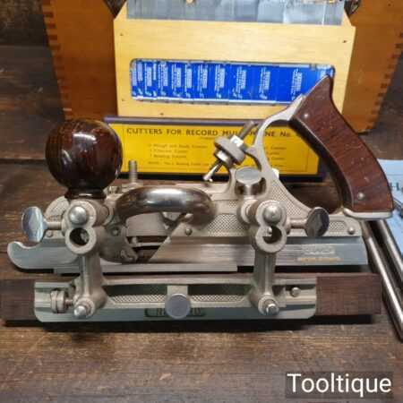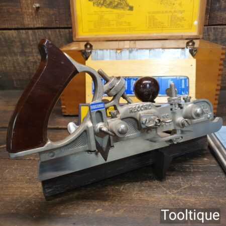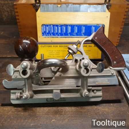 Vintage boxed Record No: 405 combination plough plane complete with 22 cutters, fully refurbished and ready for use. The plane is in good condition and all components move smoothly. Note: We do not sharpen the irons.