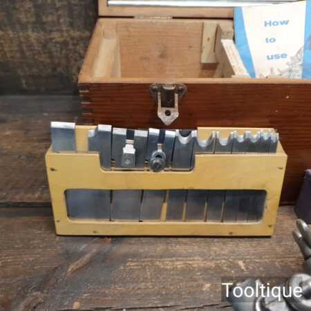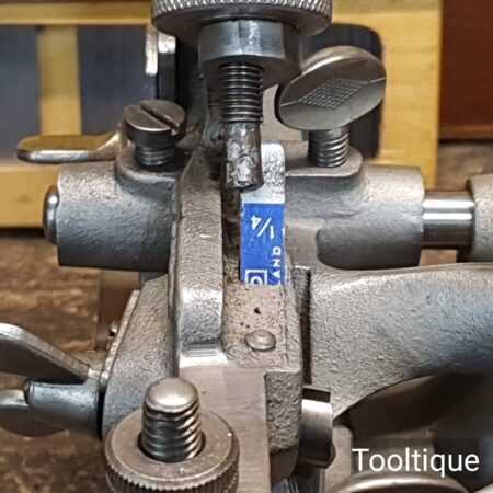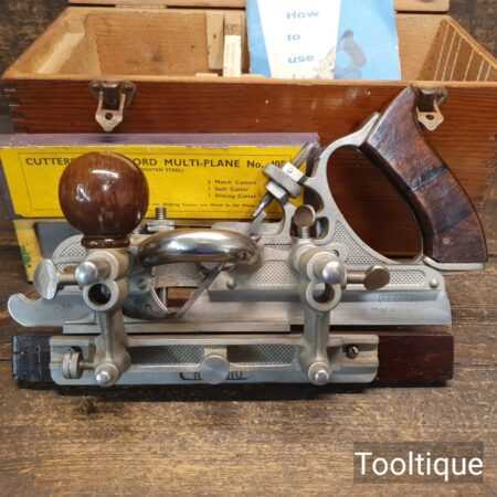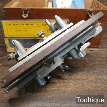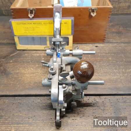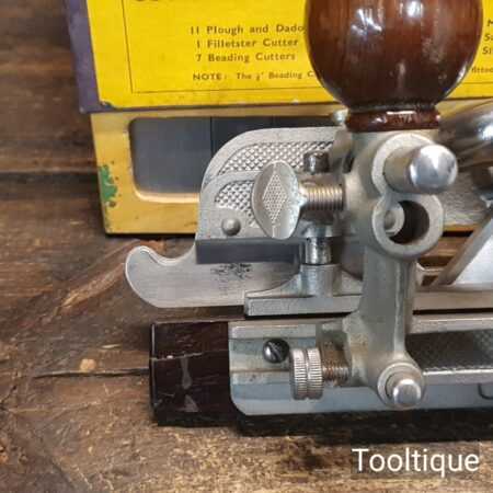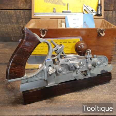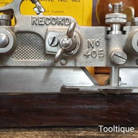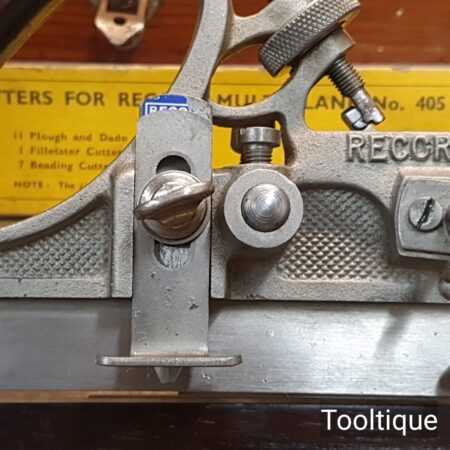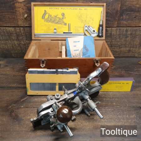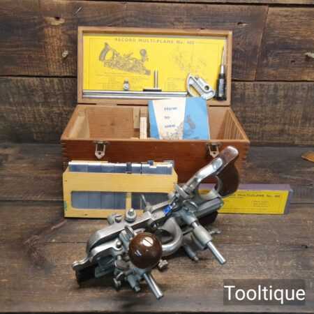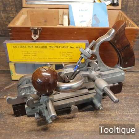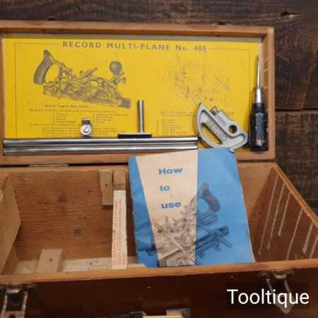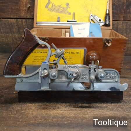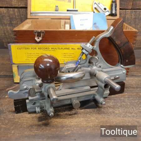 Vintage boxed Record No: 405 combination plough plane complete with 22 cutters, fully refurbished and ready for use. The plane is in good condition and all components move smoothly. Note: We do not sharpen the irons.
