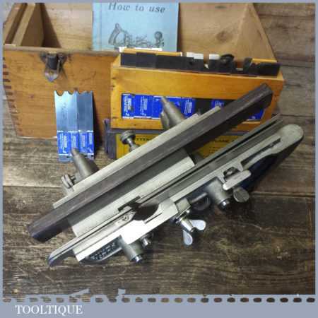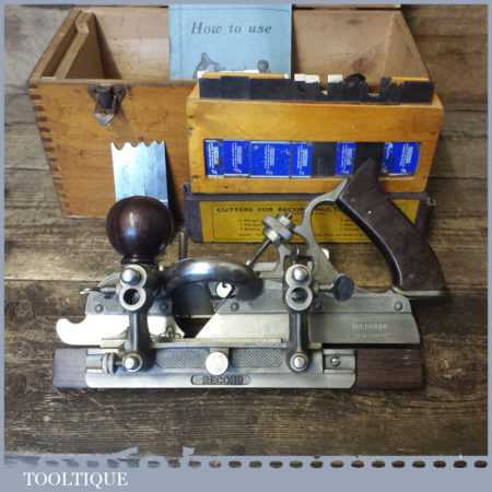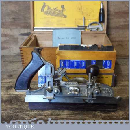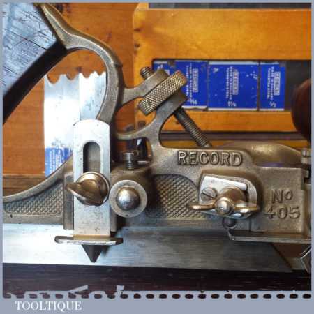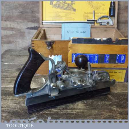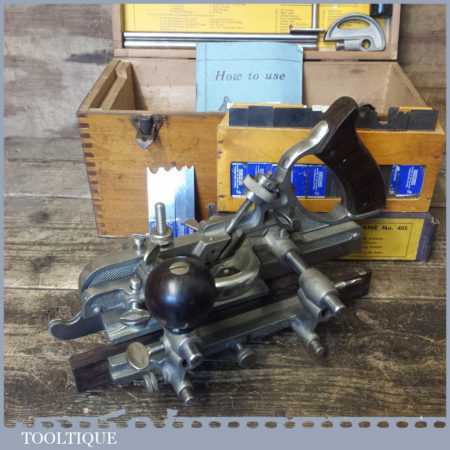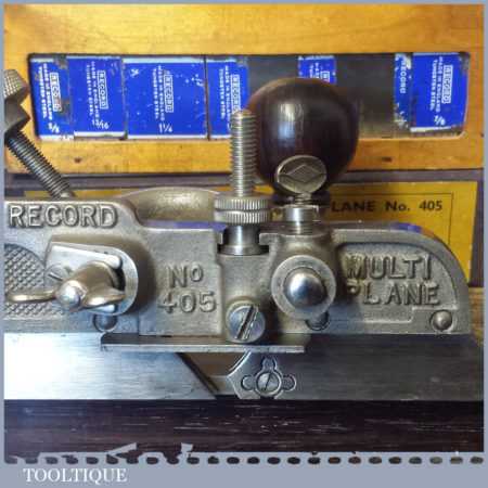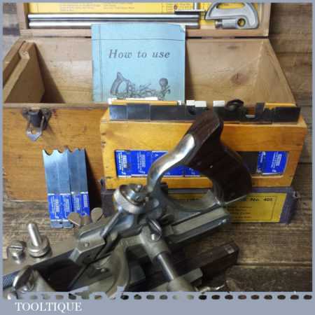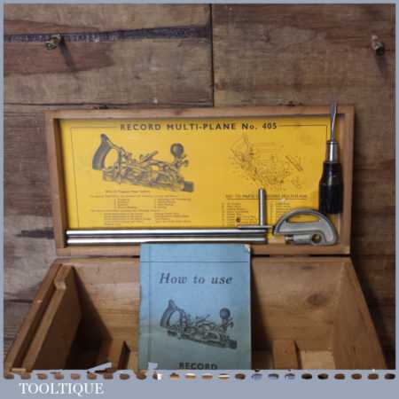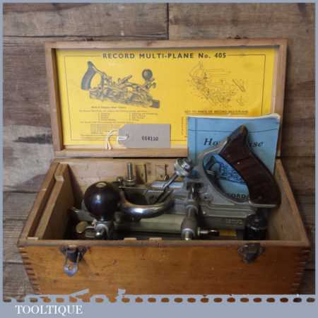 Vintage boxed Record No: 405 combination plough plane complete with 22 cutters, fully refurbished and ready for use. The plane is in good condition and all components have been checked to ensure it is complete and move smoothly. Note: We do not sharpen the irons.