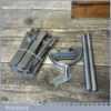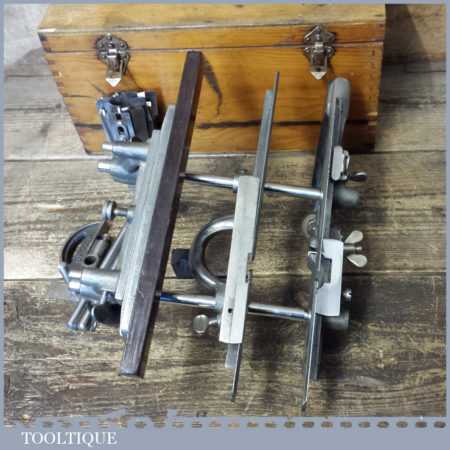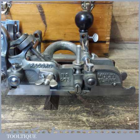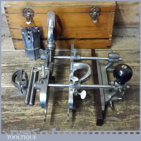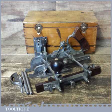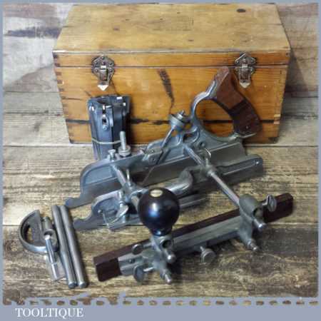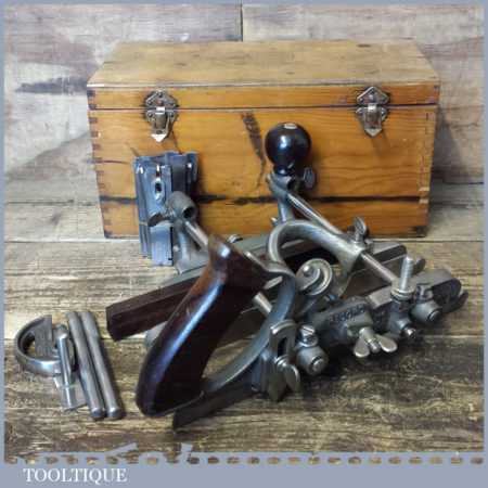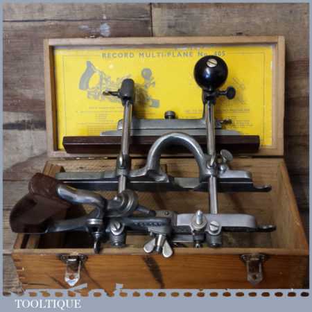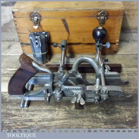 Vintage boxed Record No: 405 combination plough plane, complete with 22 cutters. The plane is in good condition and all components move smoothly. Note: We do not sharpen the irons and it has no cutter box.