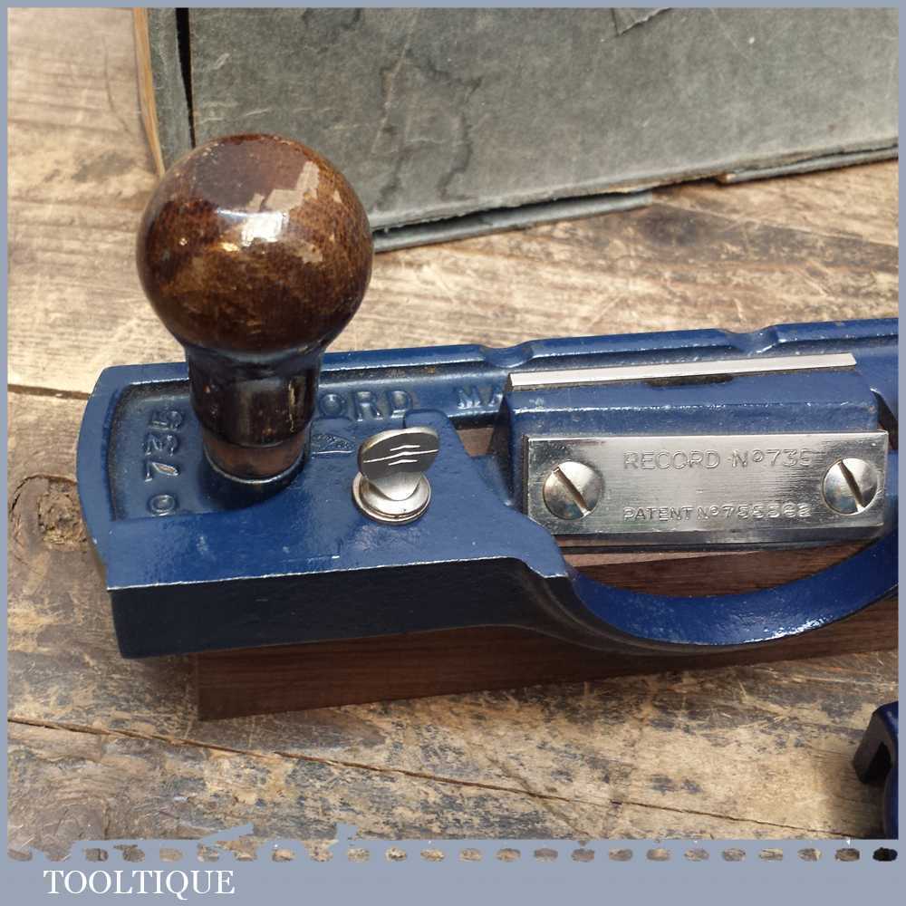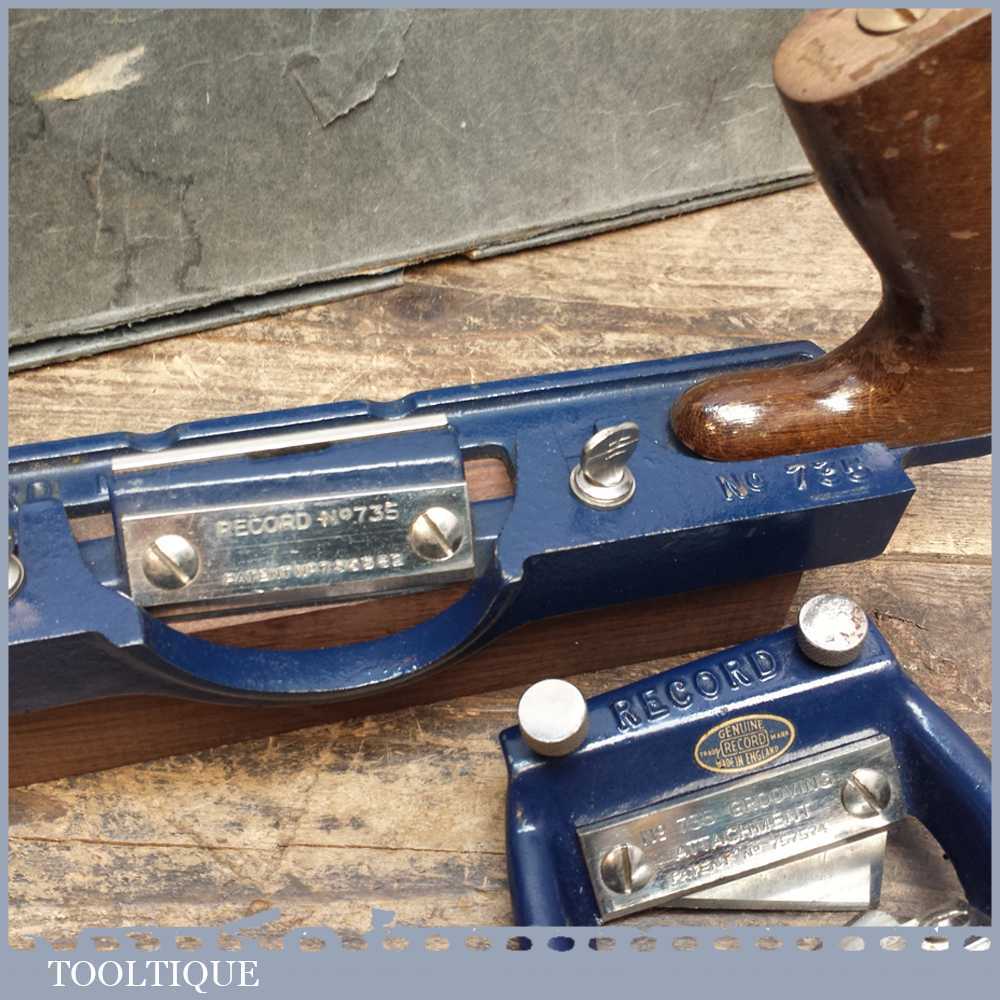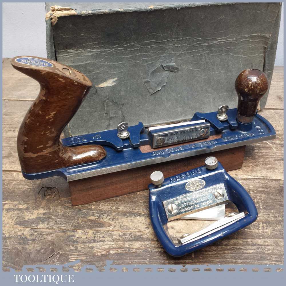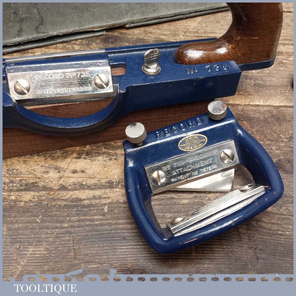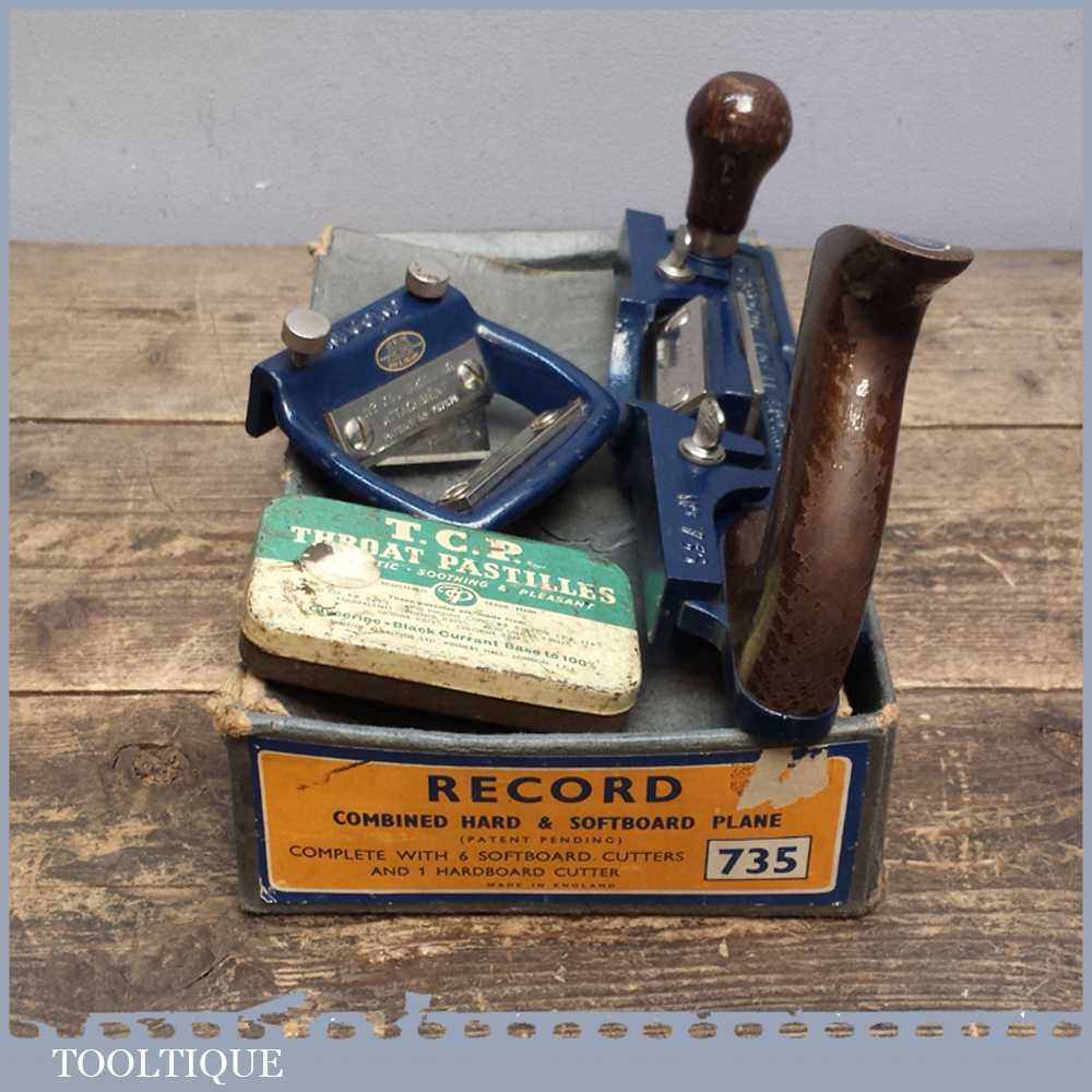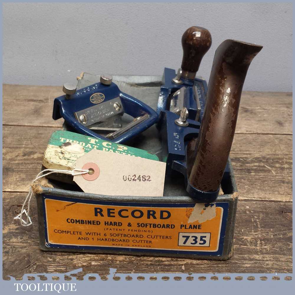 Vintage Boxed Record No: 735 fibreboard plane with grooving attachment manufactured between 1955-80. The 735 plane is used for slitting and bevelling soft insulating board as well bevelling hardboard.