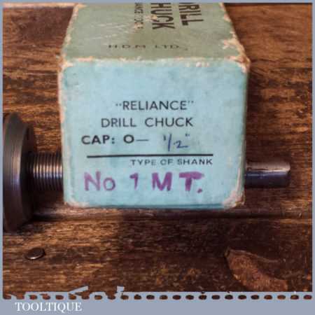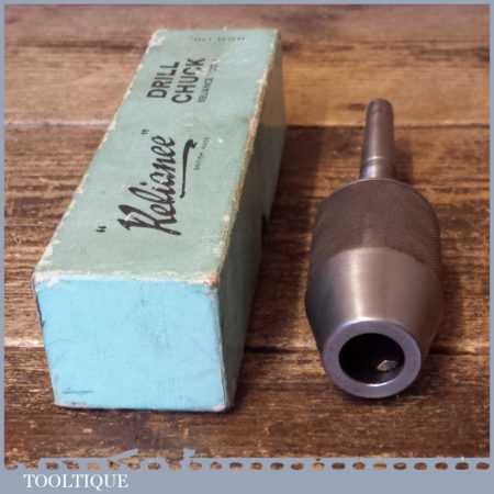 Vintage boxed Reliance keyless drill chuck for lathe or drill stand with a ½” tapered shank in good used condition.
