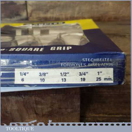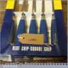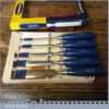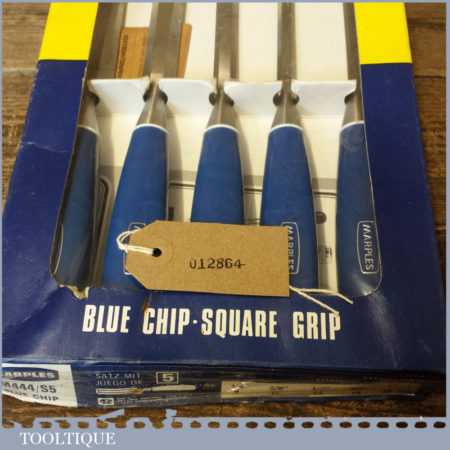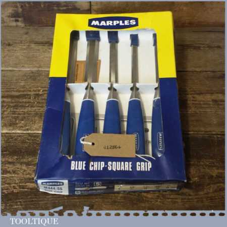 Vintage boxed set of 5 No: Marples blue chip bevel edge chisels (1/4”, 3/8”, 1/ 2”, 3/4” & 1”) with plastic handles in good used condition ready for use. Rarely do you find these in their original boxes, these chisels have seen very little use.