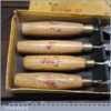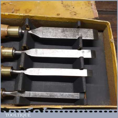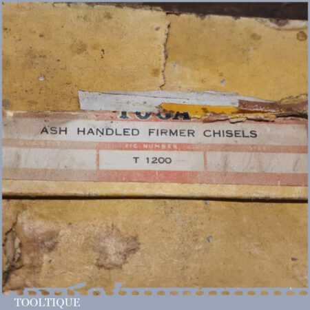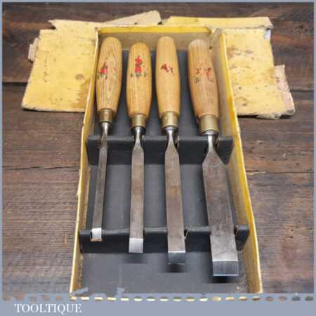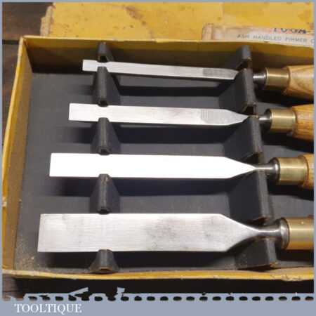 Vintage boxed set of Buck & Hickman Toga brand firmer chisels (1/4”, 3/8”, 1/2” & 3/4”) with ash handles, in good used condition and ready for use. All refurbished chisels are water cooled during the sharpening process to ensure the tempering is not affected.