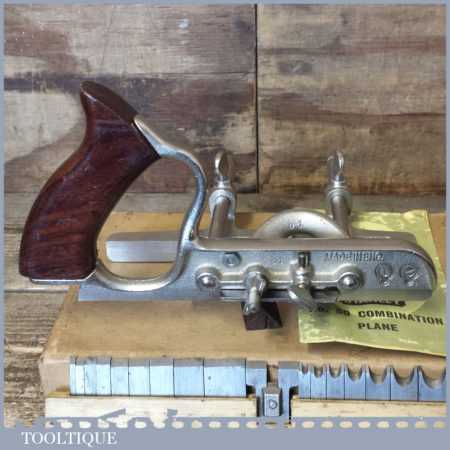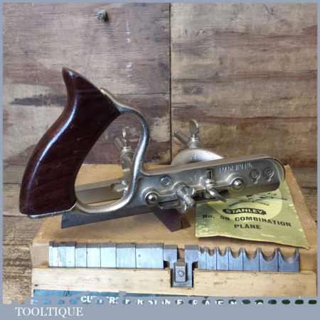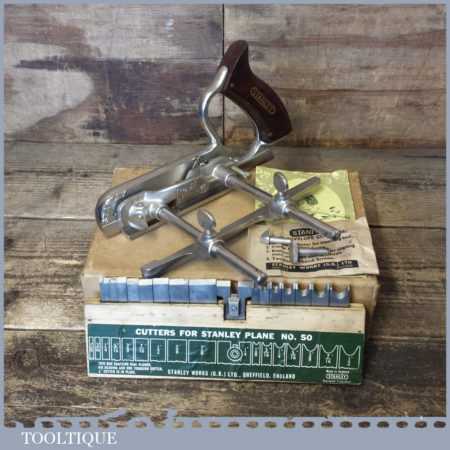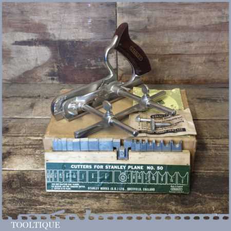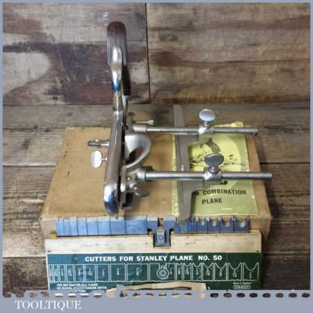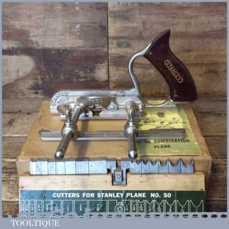 Vintage boxed Stanley England No: 50 combination plough plane complete with 17 cutters, fully refurbished and ready for use. The plane is in good condition and all components move smoothly. Note: We do not sharpen the irons.