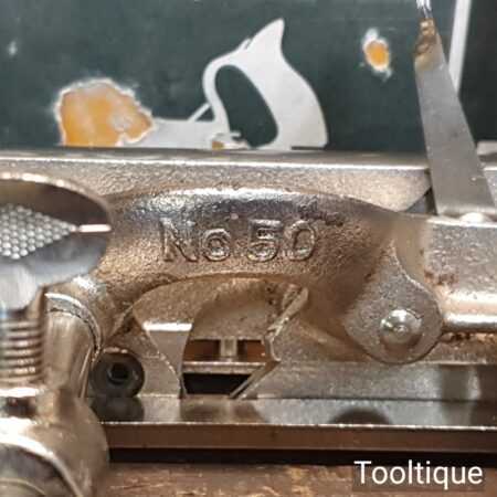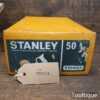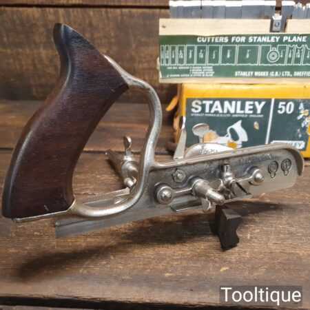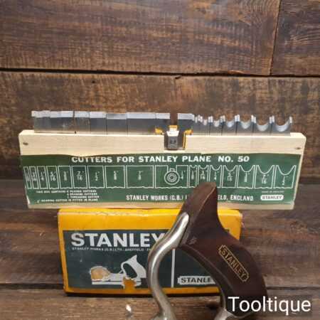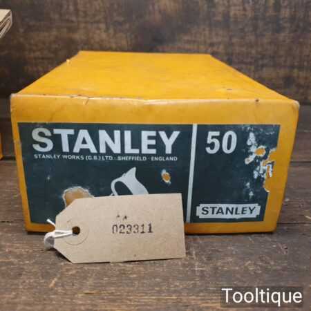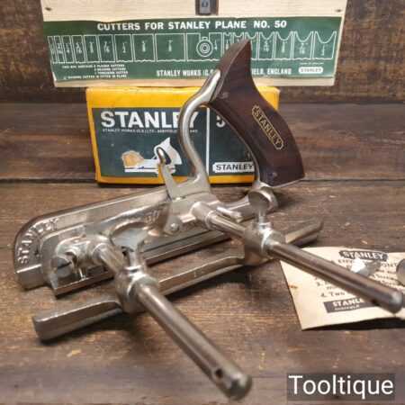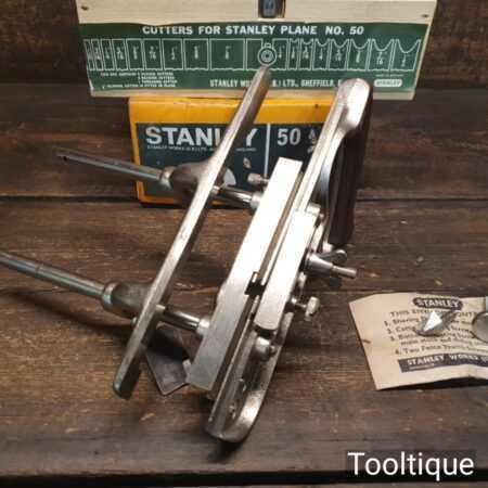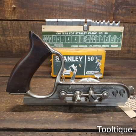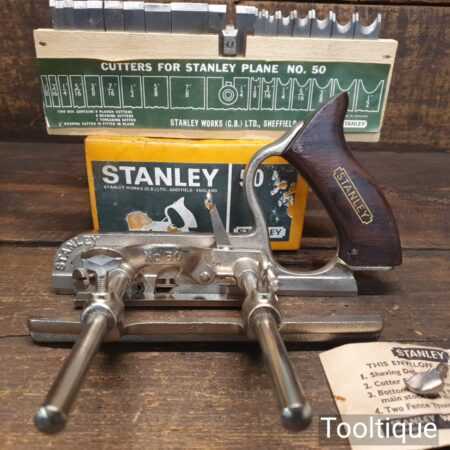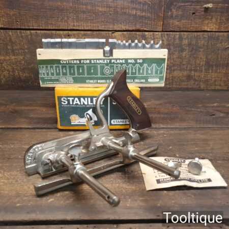 Vintage boxed Stanley England No: 50 combination plough plane complete with 17 cutters, fully refurbished and ready for use. The plane is in good condition and all components move smoothly. Note: We do not sharpen the irons.