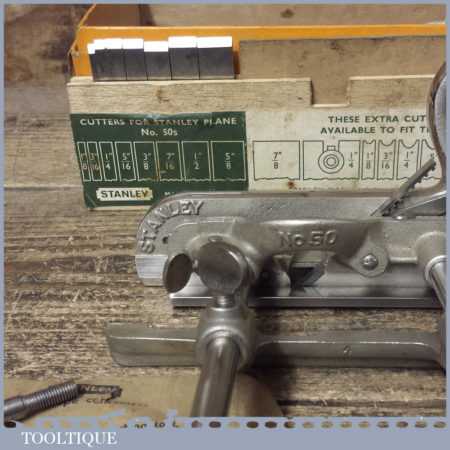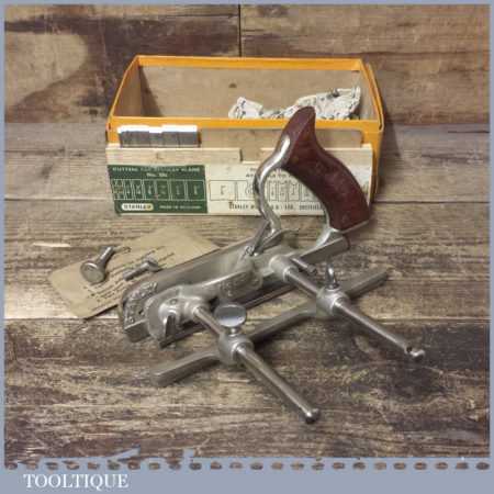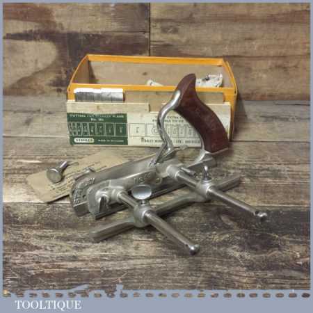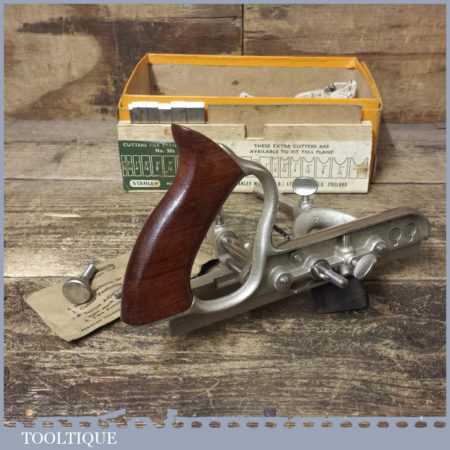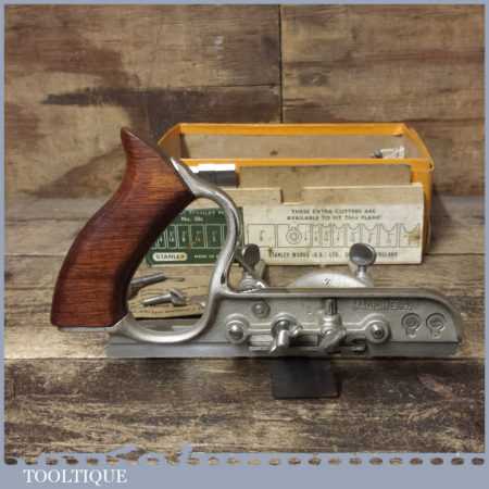 Vintage boxed Stanley, England No: 50s combination plough plane complete with 8 cutters, fully refurbished and ready for use. The plane is in good condition and all components move smoothly. Note: We do not sharpen the irons.