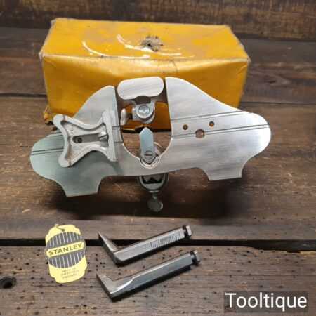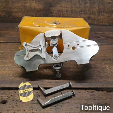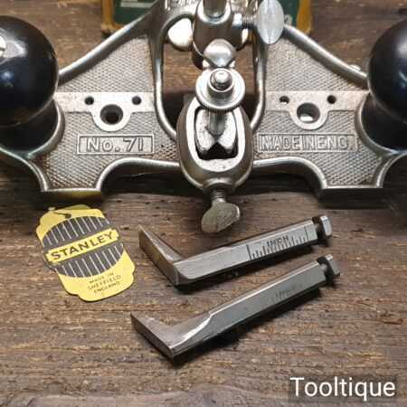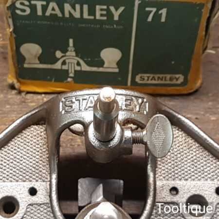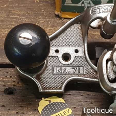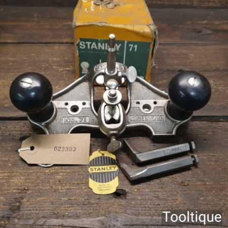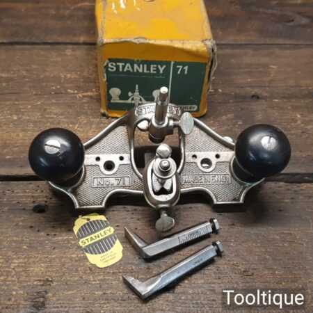 Vintage boxed Stanley England No: 71 hand router plane complete with fence, depth stop and 3 irons and in good used condition.