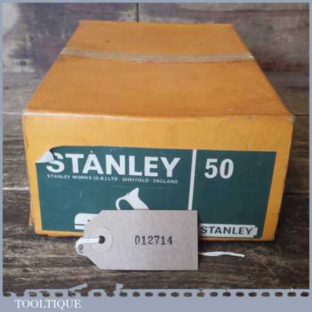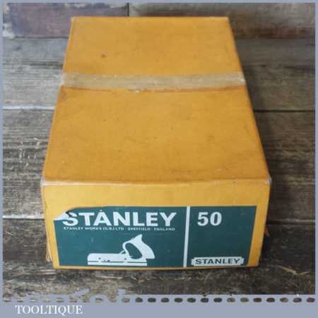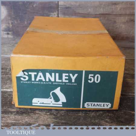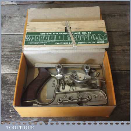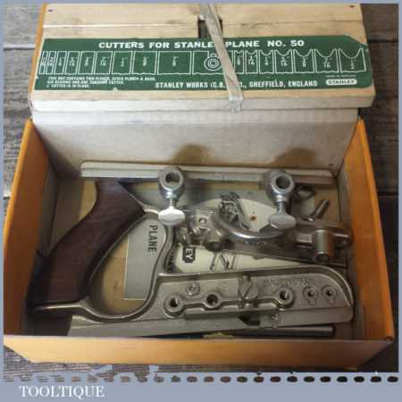 Vintage boxed Stanley No: 50 combination plough plane complete with 17 cutters and ready for use. The plane is in excellent condition and all components move smoothly. Note: We do not sharpen the irons.