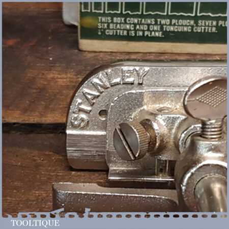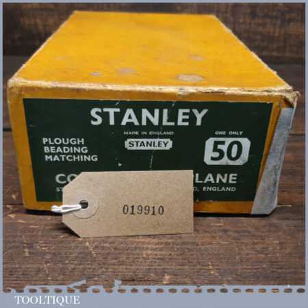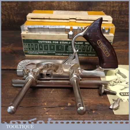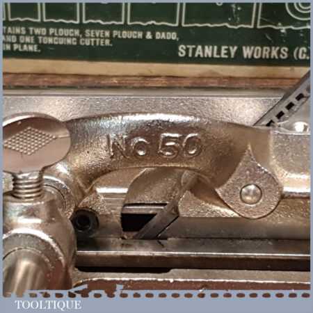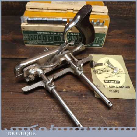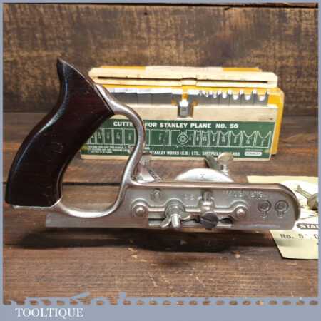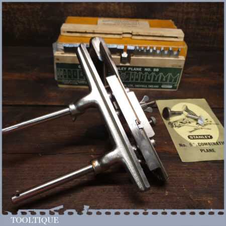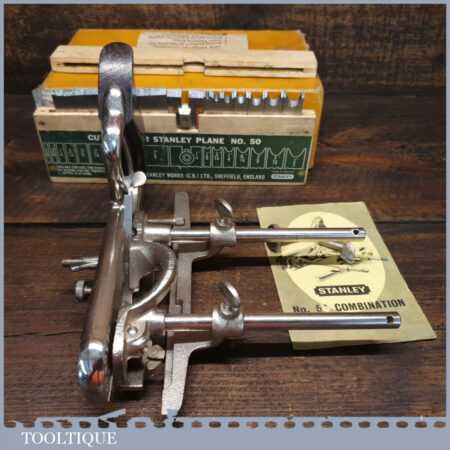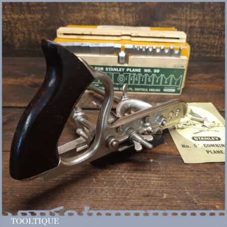 Vintage boxed Stanley England No: 50 combination plough plane complete with 17 cutters, fully refurbished and ready for use. The plane is in good condition and all components move smoothly. Note: We do not sharpen the irons.