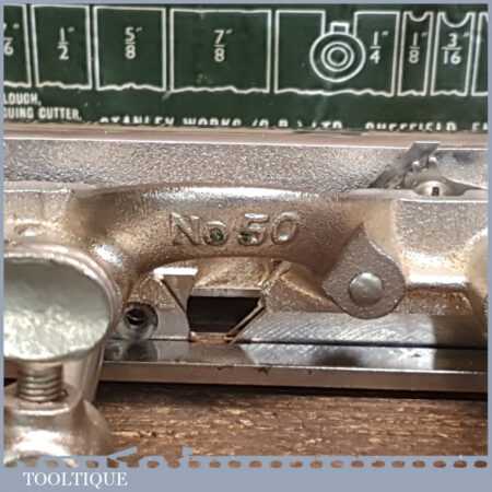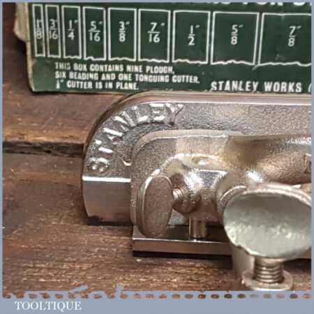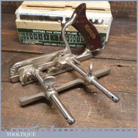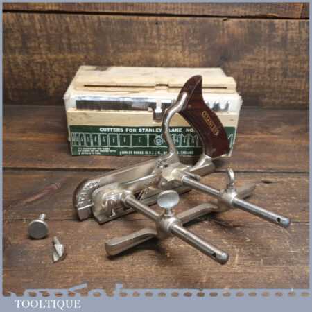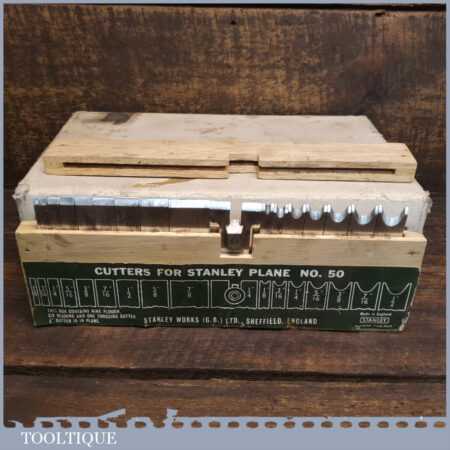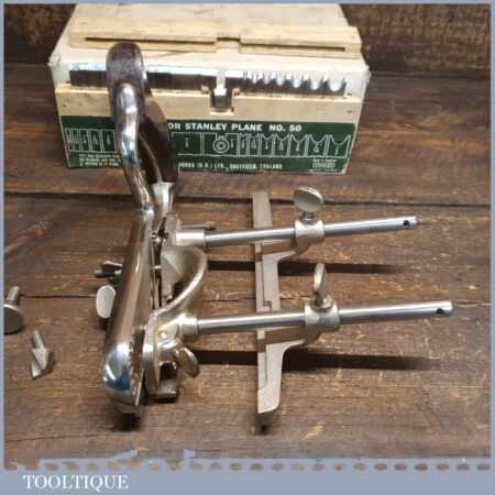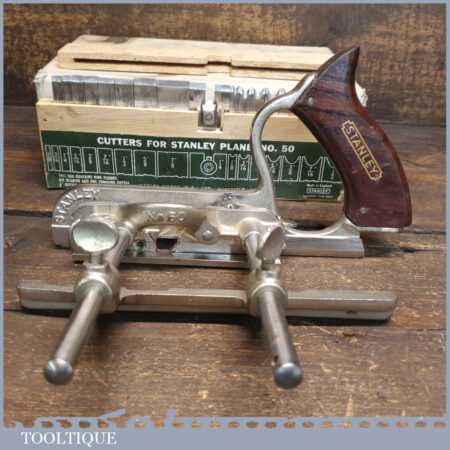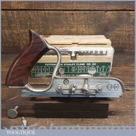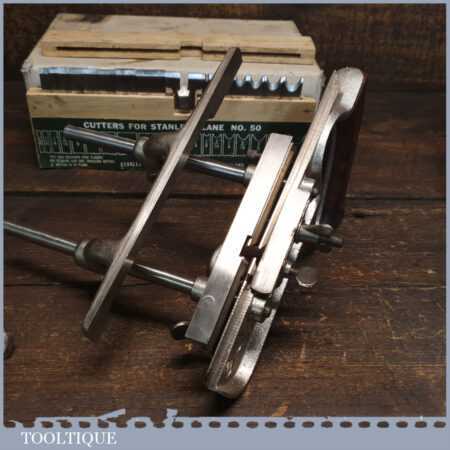 Vintage boxed Stanley England No: 50 combination plough plane complete with 17 cutters, fully refurbished and ready for use. The plane is in good condition and all components move smoothly. Note: We do not sharpen the irons.