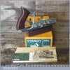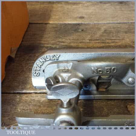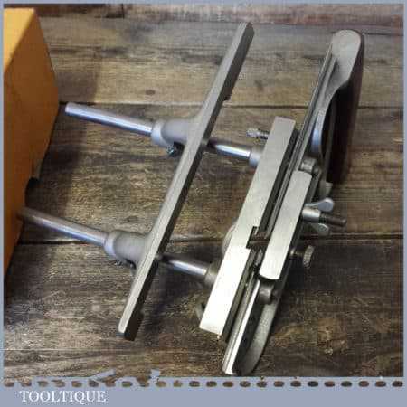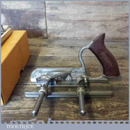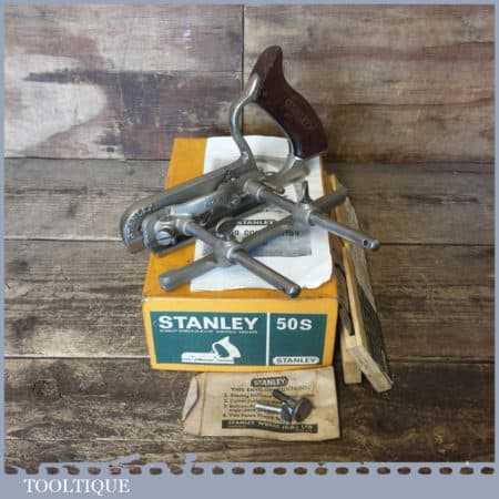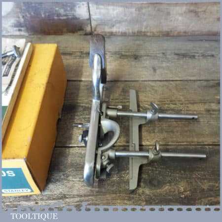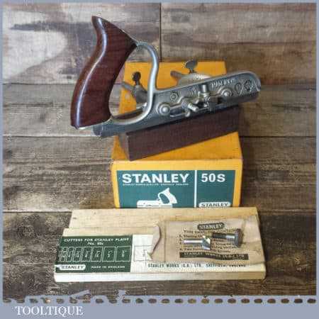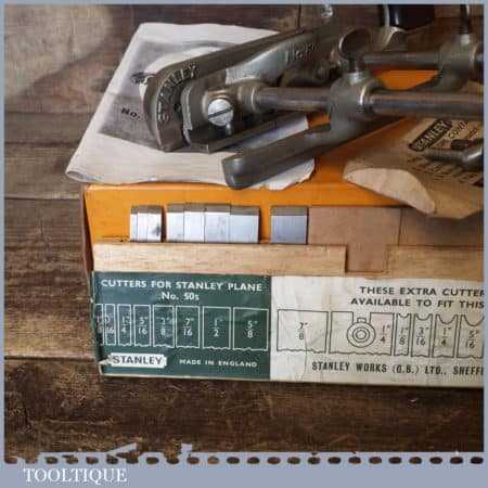 Vintage boxed Stanley No: 50s combination plough plane complete with 8 cutters, fully refurbished and ready for use. The plane is in good condition and all components move smoothly. Note: We do not sharpen the irons.